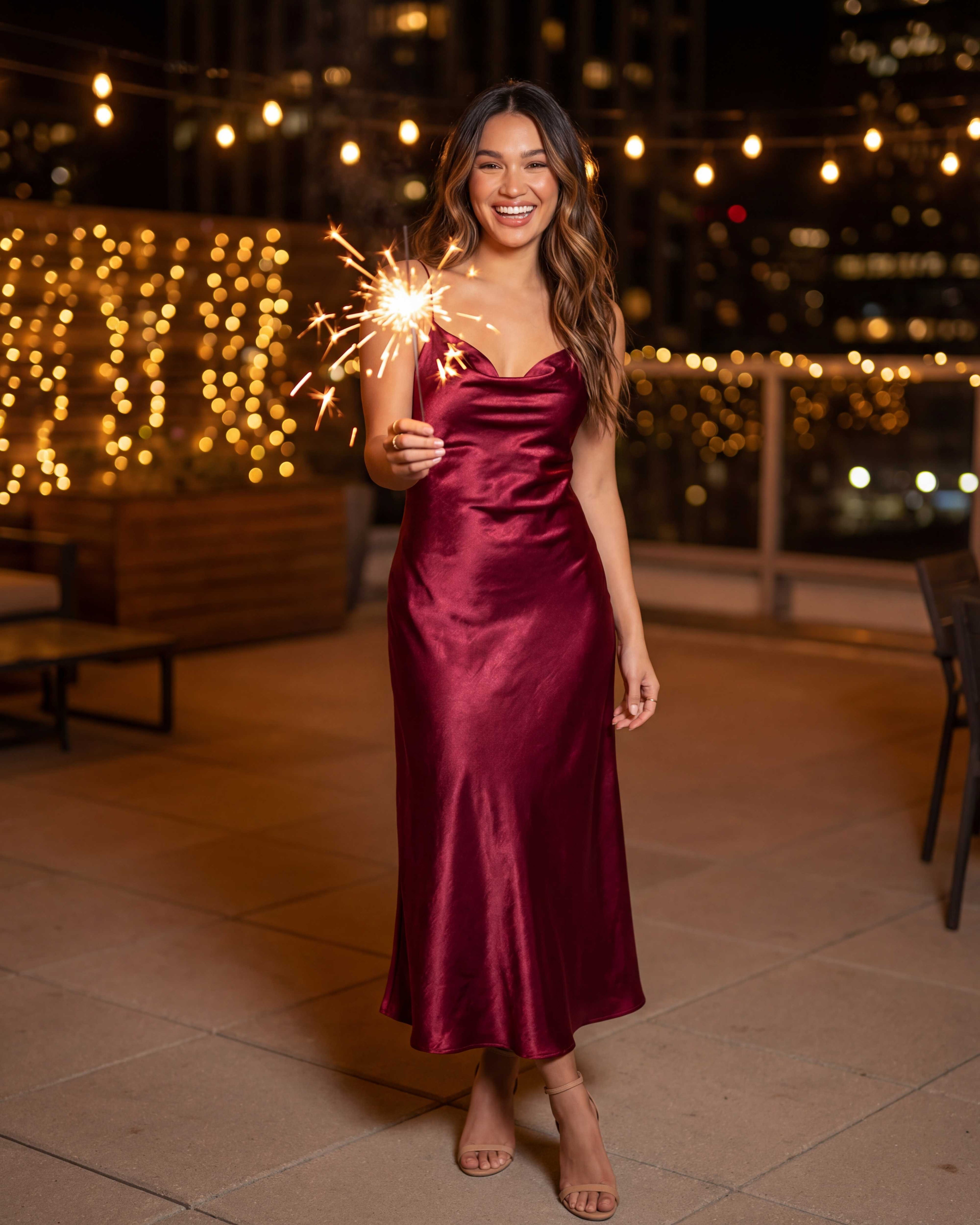 Model wearing Mocha Muse Midi Dress in chocolate tone with open back and red heels, seated on a stylish sofa.