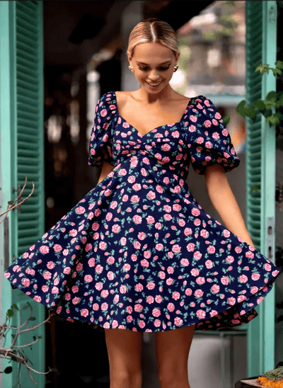 Cherry Kiss Mini Dress featuring cherry print, sweetheart neckline, and puff sleeves, perfect for summer occasions.