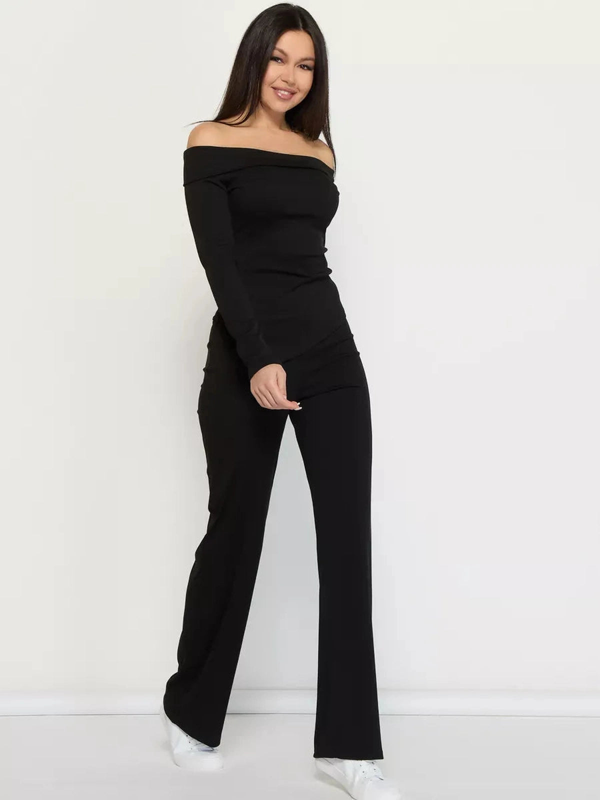 Fashion model wearing a red long-sleeved jumpsuit with flared legs and a stylish handbag.