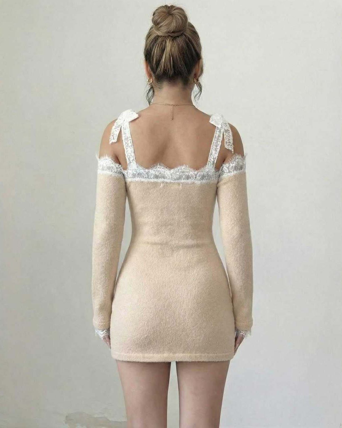 فستان ميني ضيق باللون البيج مع حواف دانتيل بأكمام طويلة للحفلات والكوكتيل والمناسبات الرسمية.