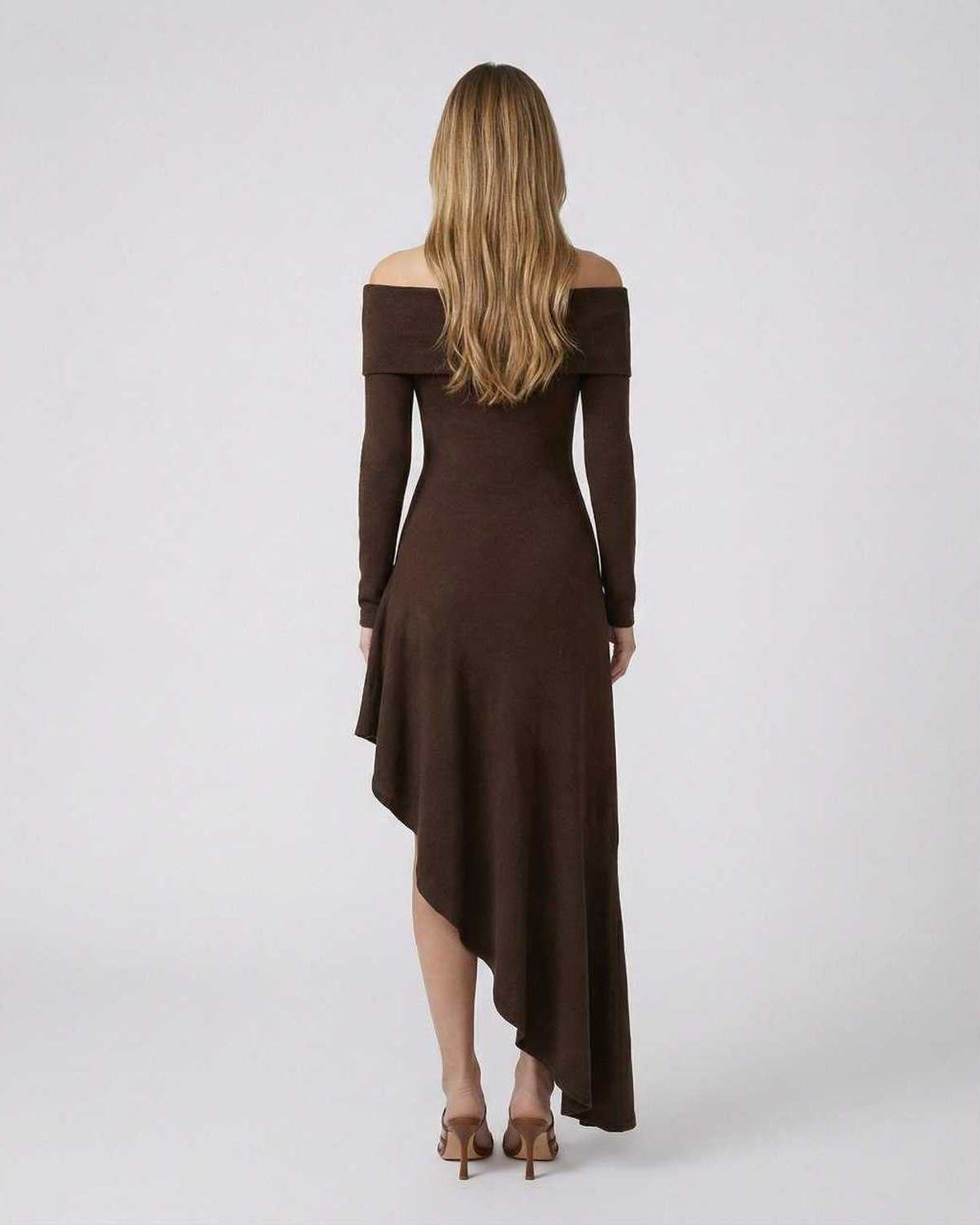 يحتوي الفستان على أكمام طويلة وخط خصر مرتفع، مما يعزز شكله الراقي مع الحفاظ على سهولة الحركة. يحيط خط العنق المكشوف الكتفين بأناقة، مما يمنحه جاذبية عصرية وفاخرة تناسب مختلف المناسبات. التشطيب النظيف والخياطة الدقيقة تؤكد على جودته الفاخرة.
