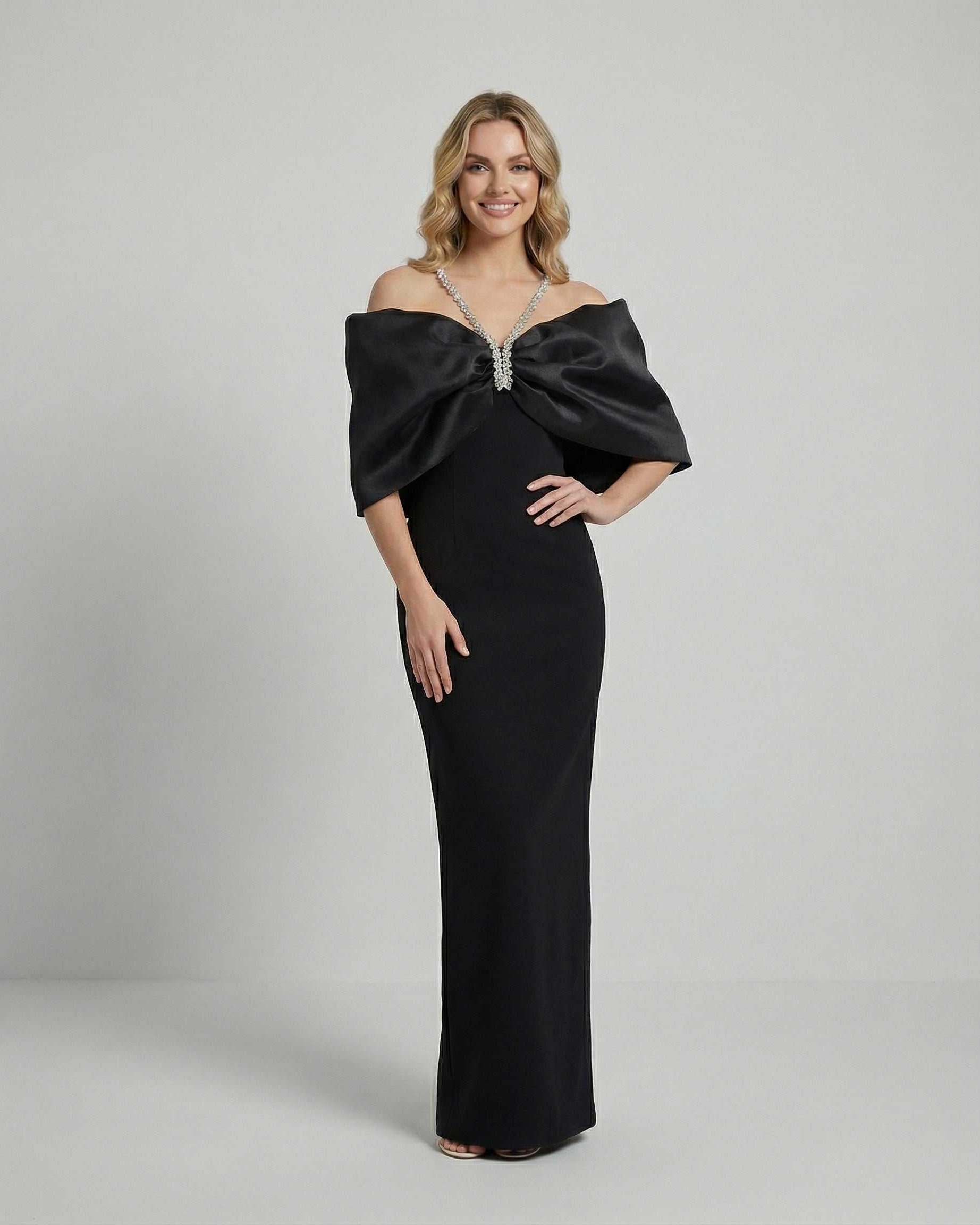 Tyto luxusní černé maxi šaty jsou vyrobeny z hladké tkané polyesterové látky, která nabízí střední pružnost pro vytříbený a zároveň pohodlný střih. Navrženy s rafinovaným odhaleným ramenem zvýrazněným nápadnou velkou mašlí, šaty ztělesňují moderní eleganci a smyslný klubový styl. Lesklý povrch a čistá silueta z nich činí výrazný kousek pro slavnostní příležitosti.