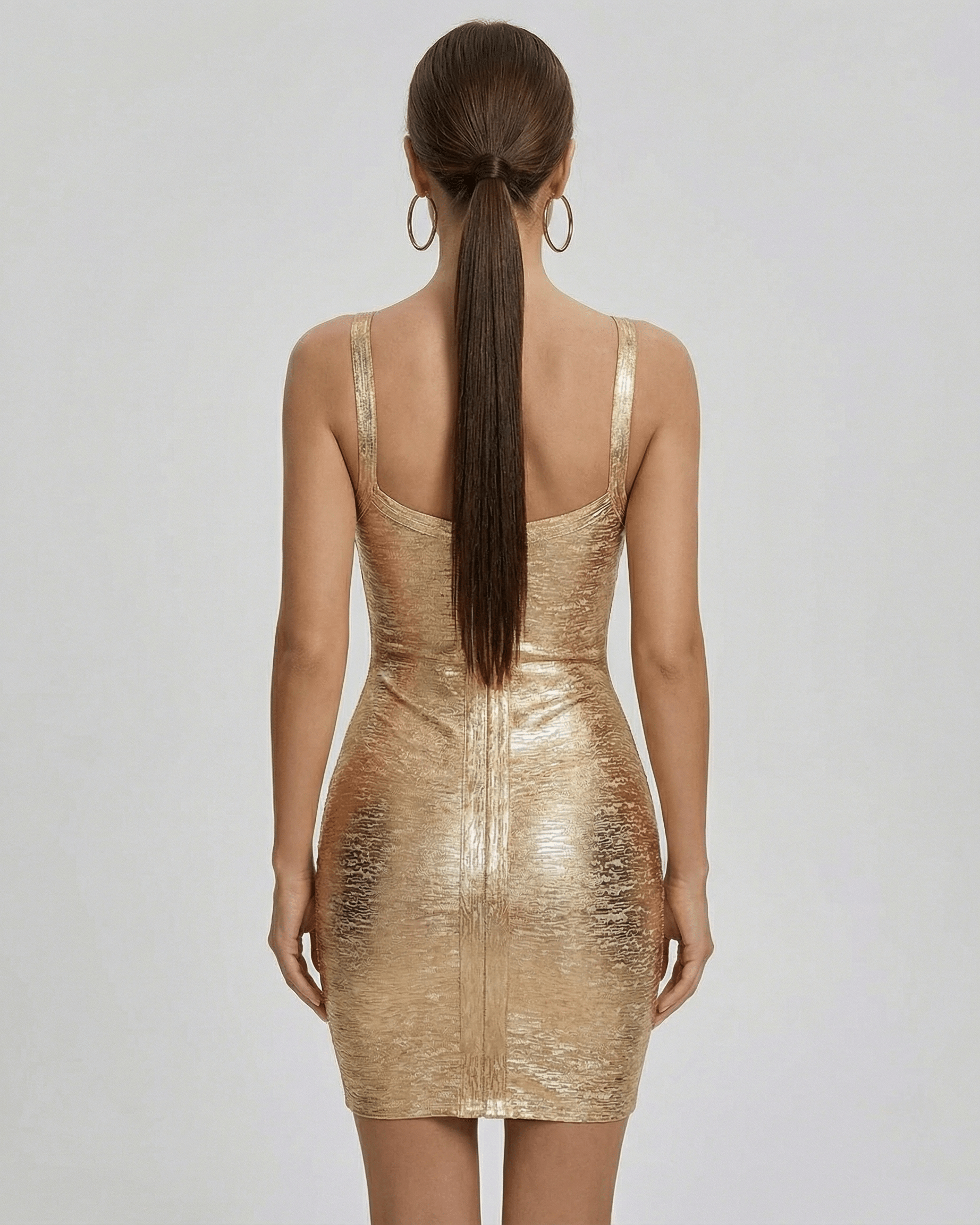 Fremstillet af højkvalitets viskosestof med en glinsende gylden finish, har denne slanke mini kjole en tætsiddende bodycon-silhuet, der er designet til at fremhæve din stil med et moderne præg. Den glatte tekstur og den diskrete metalliske glans giver et sofistikeret og strålende udtryk, perfekt til at gøre indtryk.