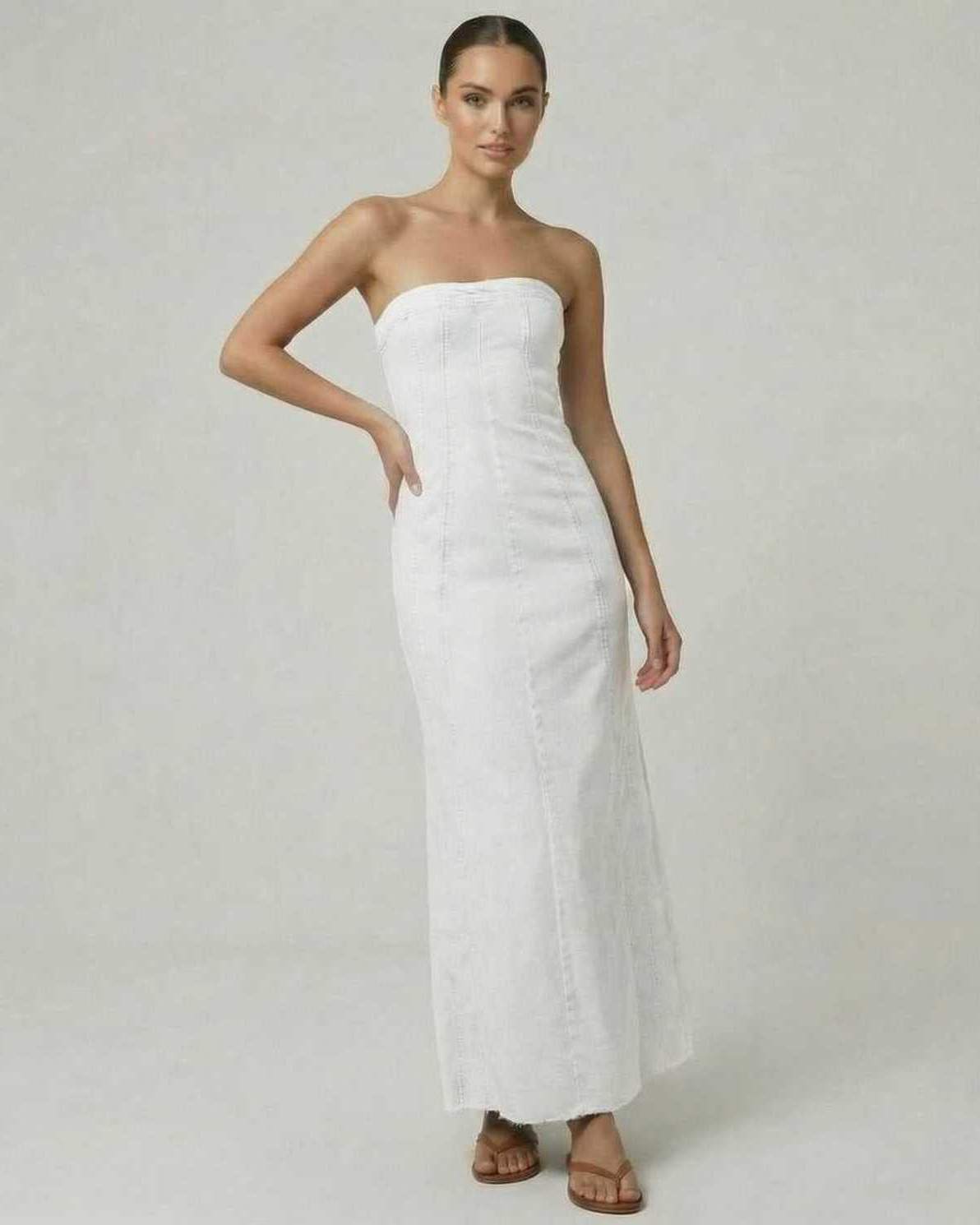 Pearl Midi Kjolen er en betagende stropløs kjole fremstillet af en hvid denim-inspireret polyester-spandex blanding, der forener komfort med sofistikeret stil. Denne ankel-lange kjole har en flatterende trompetform, der blidt udvider sig fra knæet og fremhæver dine naturlige former samtidig med, at den giver bevægelsesfrihed.