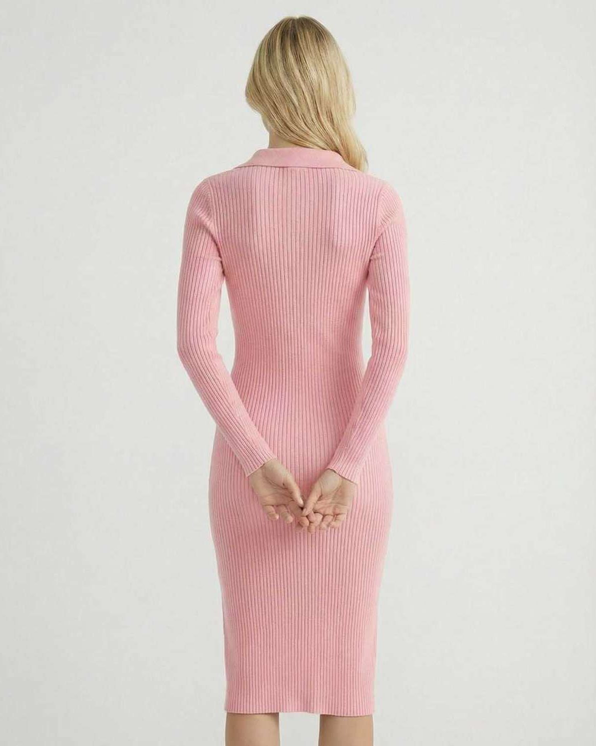 Perfekt som en lyserød strikket midi kjole til dagsbrug eller poleret aftenbeklædning, balancerer denne alsidige hverdagsmidi kjole komfort og elegance. Den strukturerede krave og den almindelige pasform giver en tidløs, figursmigrende form, der passer til arbejde, fritid og forfinede hverdagsoutfits.