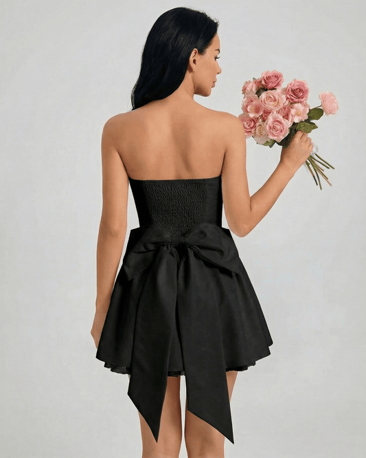 • Noelle Mini Dress by Lauven, black strapless sheath with ruffle detail, showcasing modern elegance and comfort.