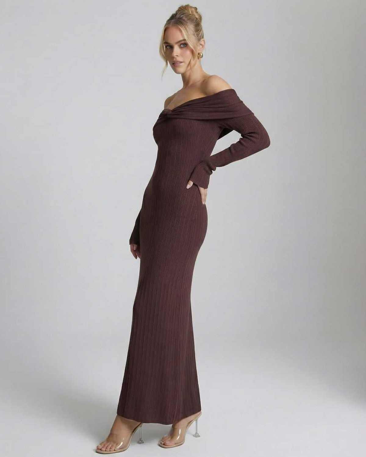 Das Sienna Maxikleid ist ein elegantes, schulterfreies Maxikleid mit langen Ärmeln in einem satten Schokoladenbraun. Gefertigt aus einer geformten, gerippten Strickstruktur, besticht dieses Maxikleid durch feine Raffungen und eine hohe Taillenlinie, die eine klare, gestreckte Silhouette schafft. Die weiche Polyesterqualität bietet eine glatte Oberfläche mit angenehmer Struktur und macht es zu einem herausragenden festlichen Maxikleid für gehobene Anlässe.
