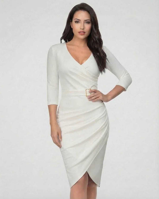 • Lauven Serena Mini Dress in soft cream, featuring side ruching and a side split, perfect for a sleek, modern silhouette.