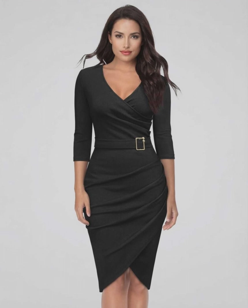 Entdecken Sie zeitlose Eleganz mit dem Nova Midi Kleid, einer perfekten Verbindung aus moderner Raffinesse und modischem Design. Dieses luxuriöse Midikleid besticht durch einen schmeichelhaften V-Ausschnitt und Dreiviertelärmel, die Ihre Silhouette mit einem schlanken Etuistil betonen. Für die anspruchsvolle Frau gefertigt, ist es die ideale Wahl für Cocktailpartys, Abendveranstaltungen oder jeden Anlass, der einen Hauch von raffinierter Eleganz verlangt.