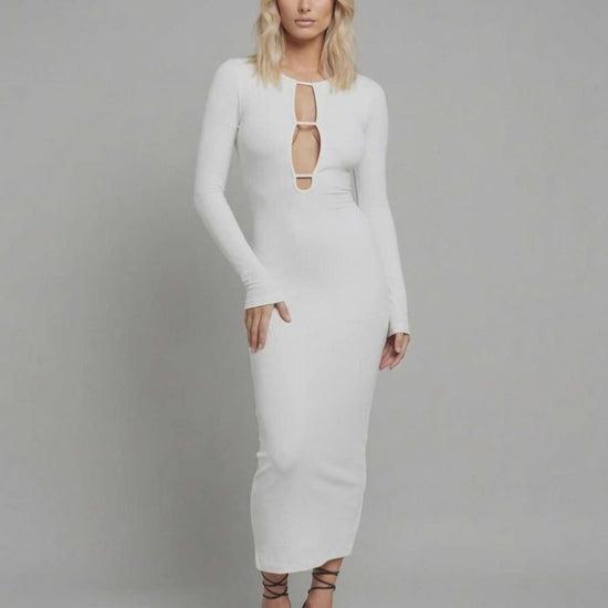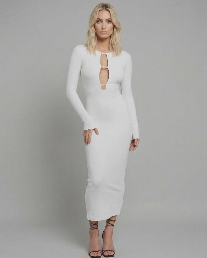 Entdecken Sie die Faszination moderner Raffinesse mit dem Nova Midi Kleid, meisterhaft gefertigt für eine modebewusste, luxuriöse Garderobe. Dieses Damen-Midi-Kleid betont eine schlanke Silhouette mit seiner figurbetonten Passform und den edlen langen Ärmeln – perfekt für jeden gehobenen Anlass. Das elegante Cut-Out-Detail auf der Vorderseite verleiht einen Hauch von gewagtem Glamour bei gleichzeitiger zeitloser Eleganz und macht dieses Kleid zu einem Must-have für Frauen, die Stil und Komfort schätzen.