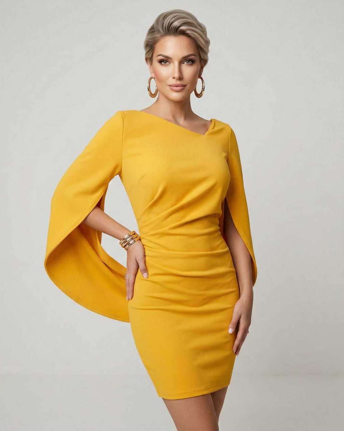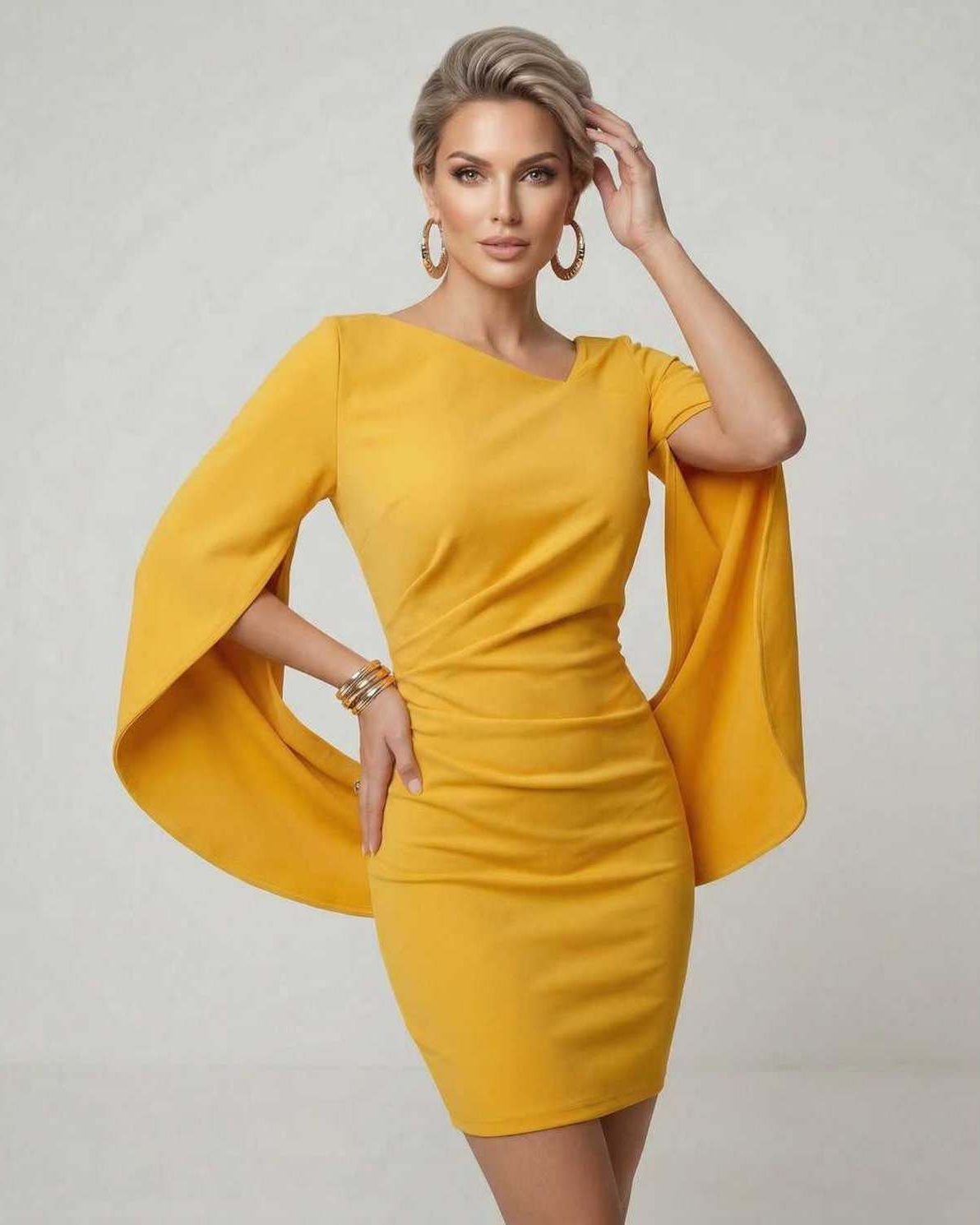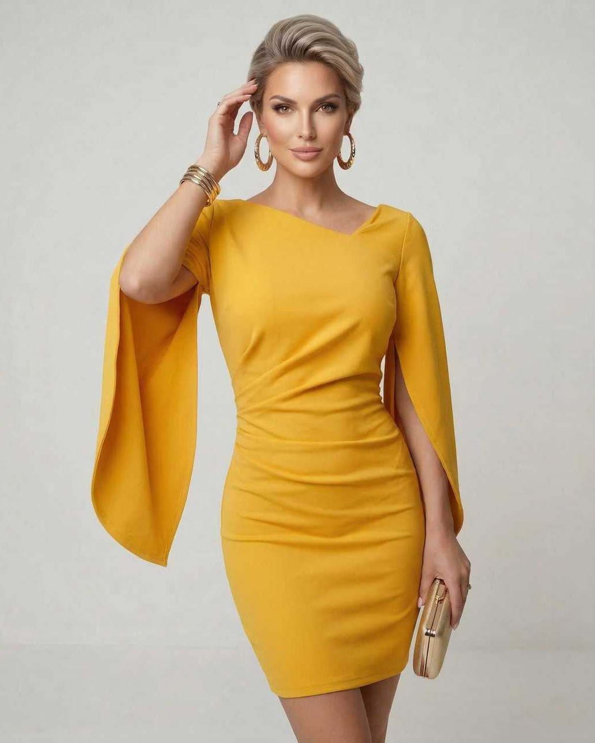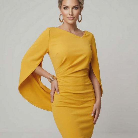 Serena Mini Kleid – Gelber Umhang-Ärmel Party-Sheath