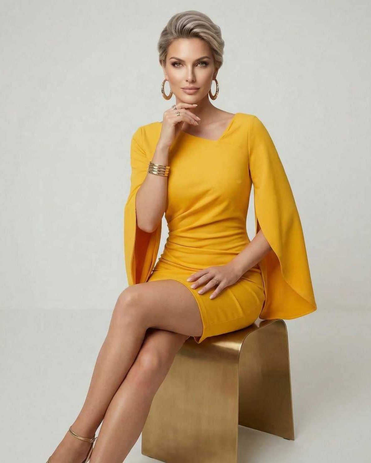Das Serena Mini Kleid ist ein auffälliges Partykleid, gefertigt aus glattem Polyesterstoff in einem lebendigen Gelbton. Mit einer Sheath-Silhouette entworfen, besticht dieses Mini-Kleid durch eine schmeichelhafte Länge oberhalb des Knies und einen eleganten Rundhalsausschnitt. Die markanten Umhang-Ärmel verleihen dem Kleid eine dramatische und stilvolle Note, die lässige Raffinesse mit zeitgenössischem Design verbindet.