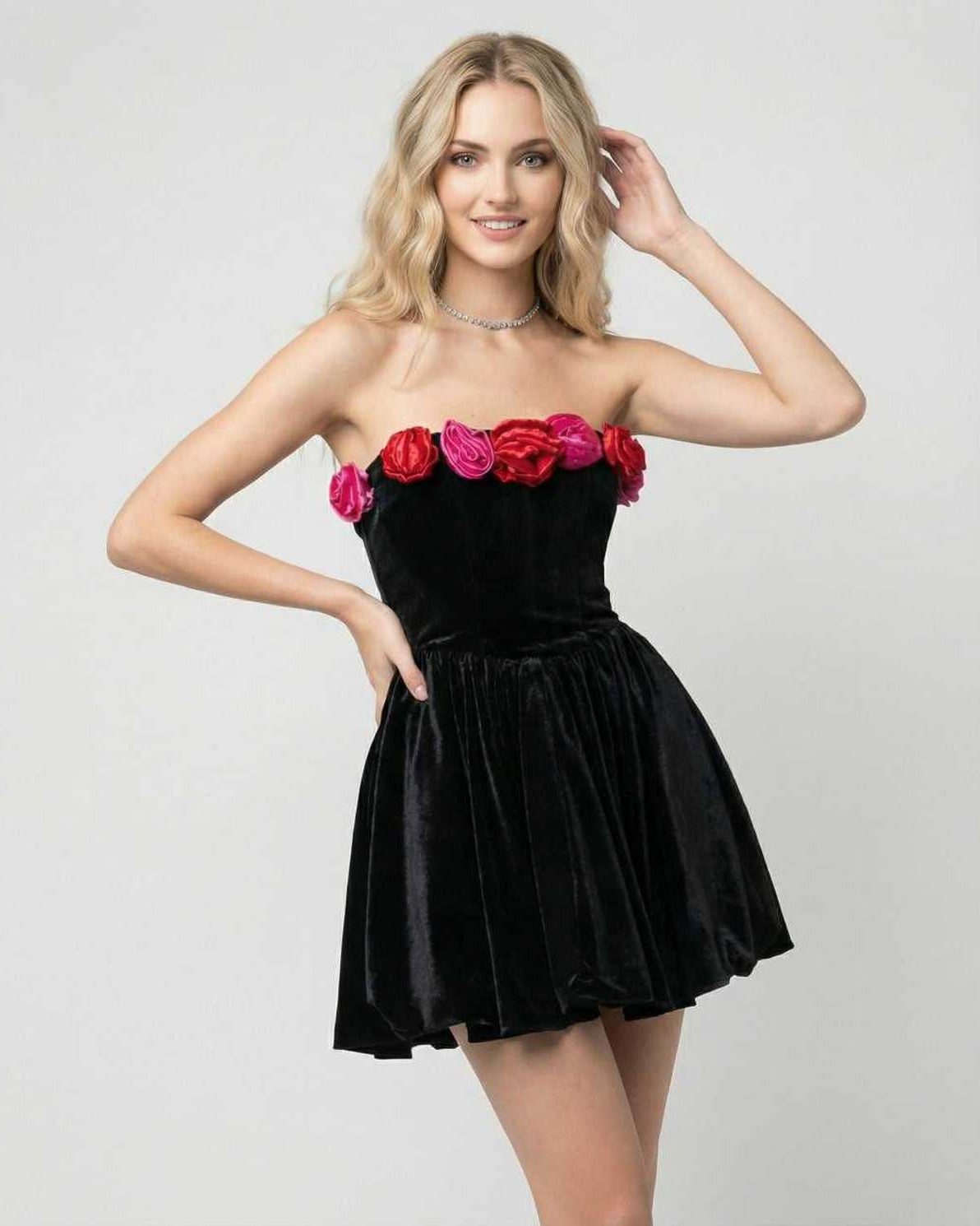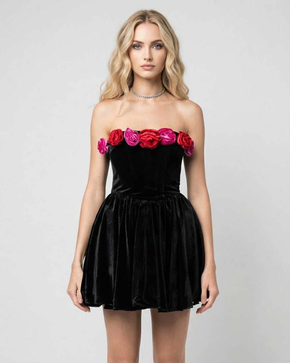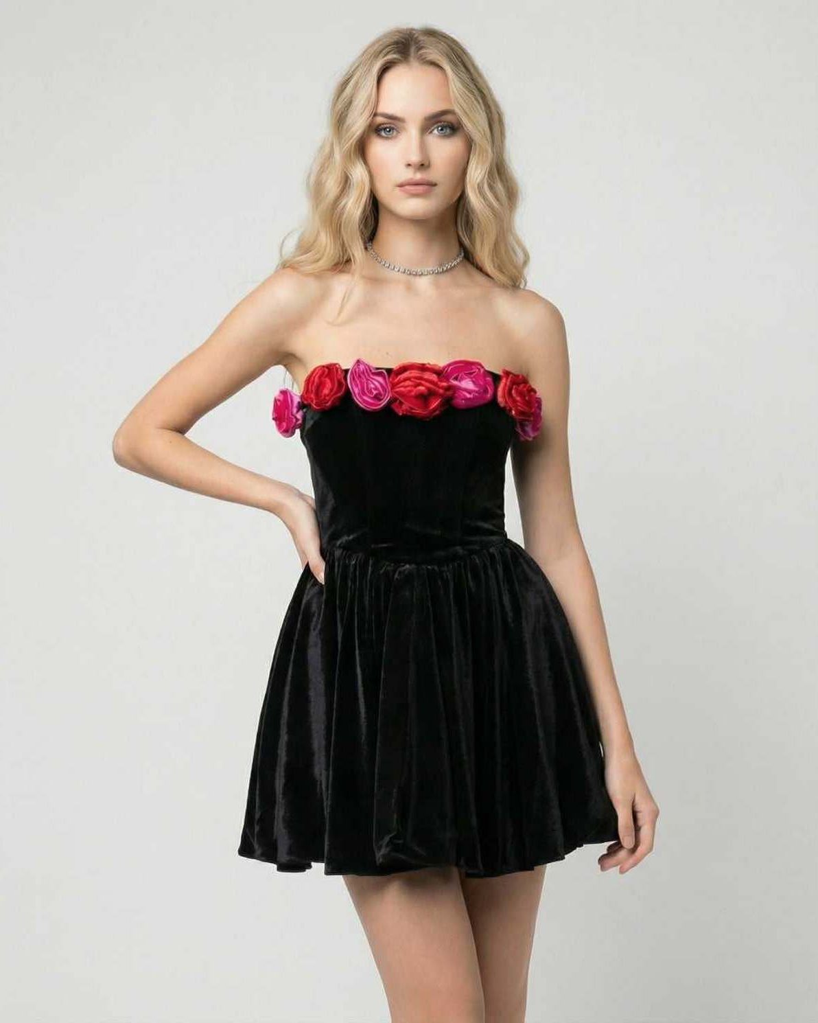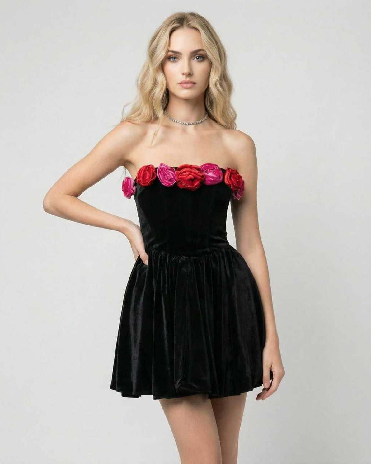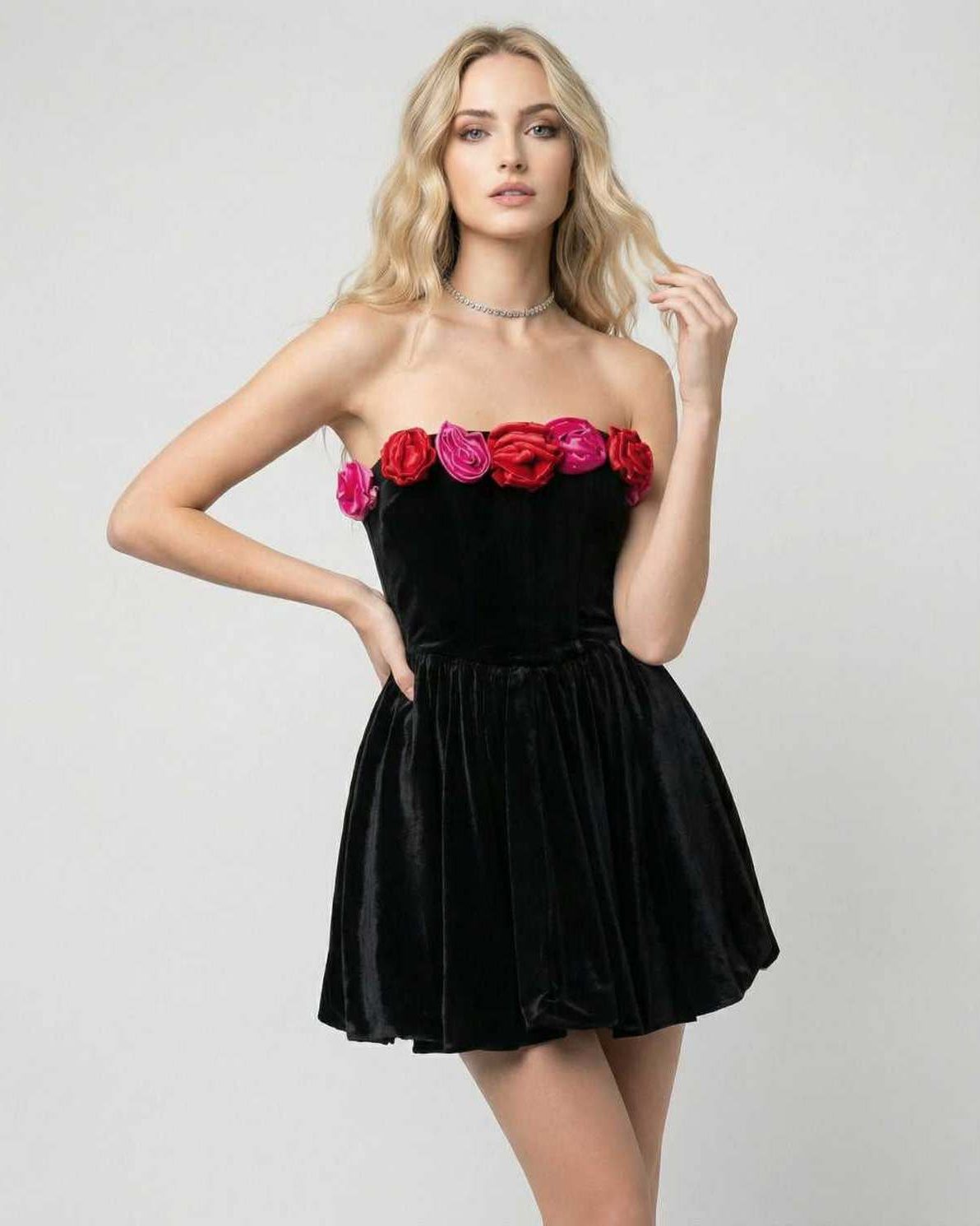 Ζήστε την αέναη κομψότητα με το Μίνι Φόρεμα Aurora, φτιαγμένο από πλούσιο βελούδινο ύφασμα πολυεστέρα. Αυτό το αμάνικο, χωρίς τιράντες σχέδιο διαθέτει εντυπωσιακή γραμμή Α και φυσική μέση, αναδεικνυόμενη από ζωηρά ανθικά κεντήματα κατά μήκος του ντεκολτέ. Το μαύρο βελούδο προσθέτει μια πολυτελή διάσταση στο φόρεμα, ιδανικό για επίσημες βραδινές περιστάσεις.