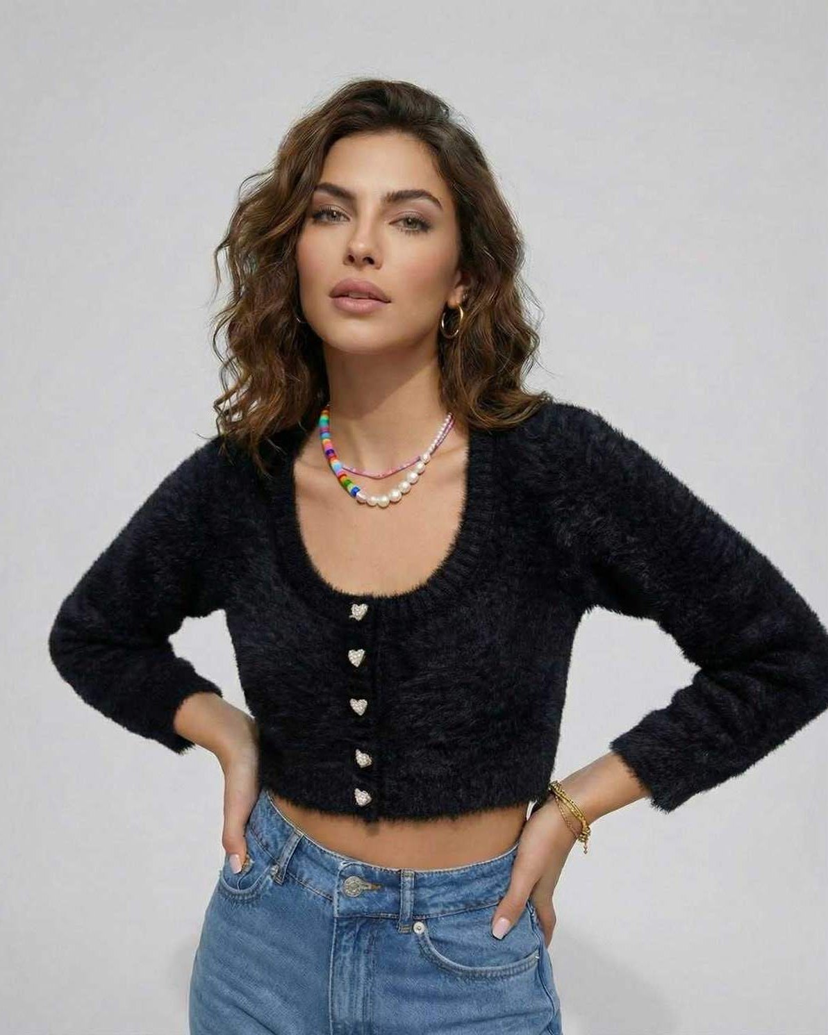 Η ζακέτα Μονακό είναι μια γυναικεία μαύρη ζακέτα σχεδιασμένη να προσφέρει διαχρονική κομψότητα με μια σύγχρονη, κοντή σιλουέτα. Κατασκευασμένη από απαλό μείγμα ακρυλικής πλέξης, αυτή η κοντή ζακέτα διαθέτει πλούσια, αφράτη υφή που προσθέτει διάσταση και ανώτερη άνεση στην καθημερινή εμφάνιση.