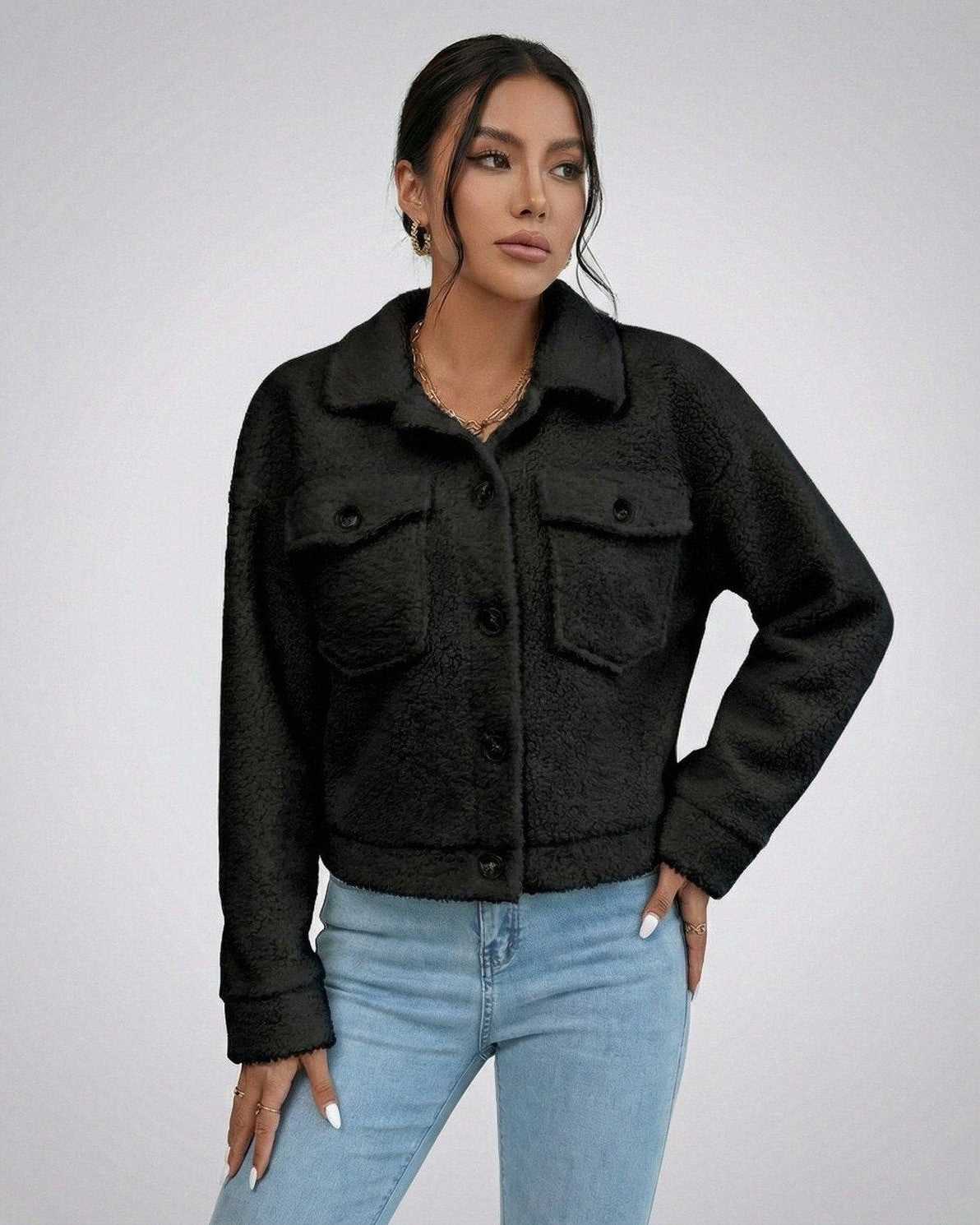 Το Γυναικείο Μαύρο Μπουφάν επανασχεδιασμένο για εκλεπτυσμένη χειμερινή ένδυση, το Μπουφάν Noir είναι ένα κομψό γυναικείο μπουφάν από συνθετική γούνα που προσφέρει ζεστασιά με σύγχρονη φινέτσα. Κατασκευασμένο από απαλό ύφασμα τύπου teddy, αυτό το γυναικείο χειμερινό μπουφάν συνδυάζει άνεση με καθαρή, δομημένη σιλουέτα.