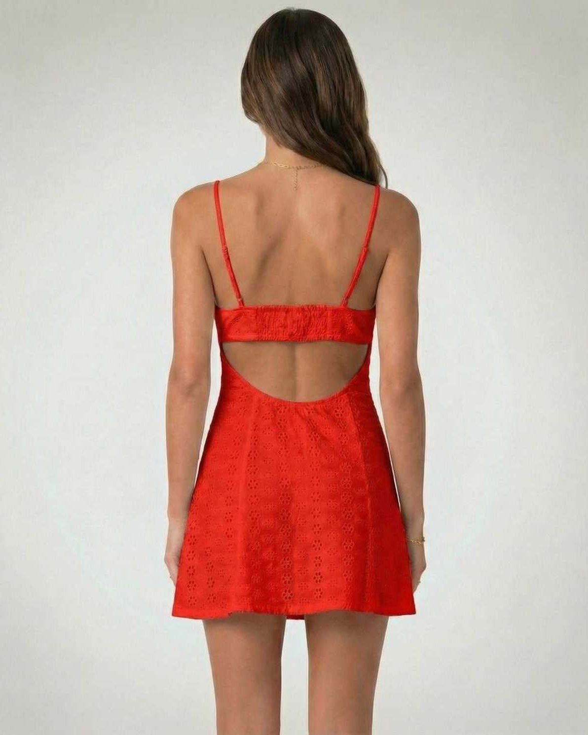 Κατασκευασμένο από εκλεπτυσμένο μείγμα βαμβακιού, πολυεστέρα και ελαστάνης, αυτό το ζωηρό κόκκινο μίνι φόρεμα Ruby διαθέτει ελαφρύ ύφασμα πολυεστέρα με διακριτικό φινίρισμα συνθετικών ινών. Προσφέροντας ελαφριά ελαστικότητα για άνετη εφαρμογή, αναδεικνύει μια δομημένη σιλουέτα Α-γραμμής με λεπτά λουλουδάτα σχέδια με διακοσμητικές τρύπες, ιδανικό για μια τολμηρή και κομψή εμφάνιση.
