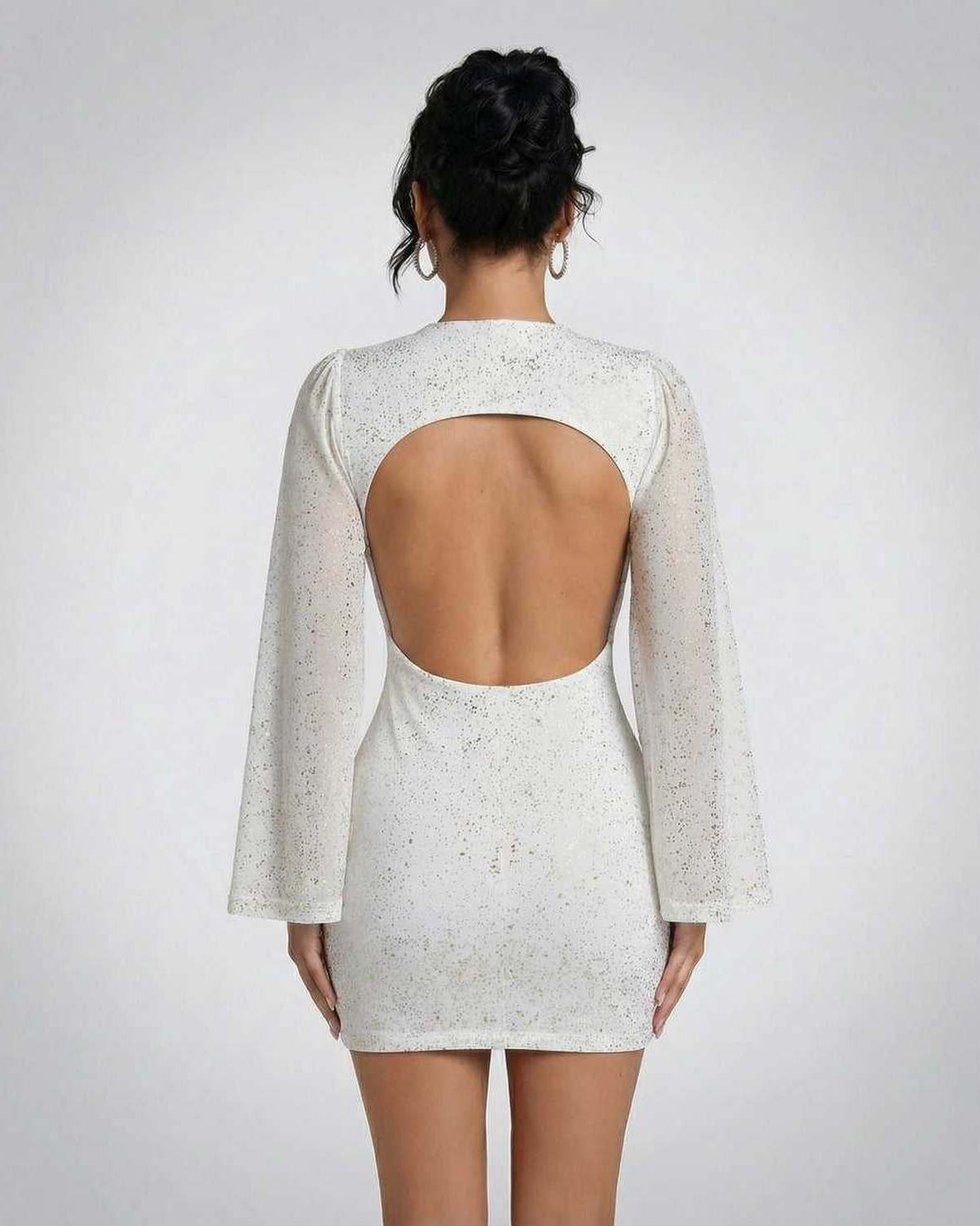Διαθέτοντας διαφανή μακριά μανίκια καμπάνα με λαμπερά χρυσά στοιχεία, το σχέδιο προσδίδει μια αέρινη, λαμπερή αίσθηση. Η ανοιχτή πλάτη αναδεικνύει το σύγχρονο στυλ του φορέματος, διατηρώντας παράλληλα άνετη εφαρμογή με κρυφό φερμουάρ στο πίσω μέρος.