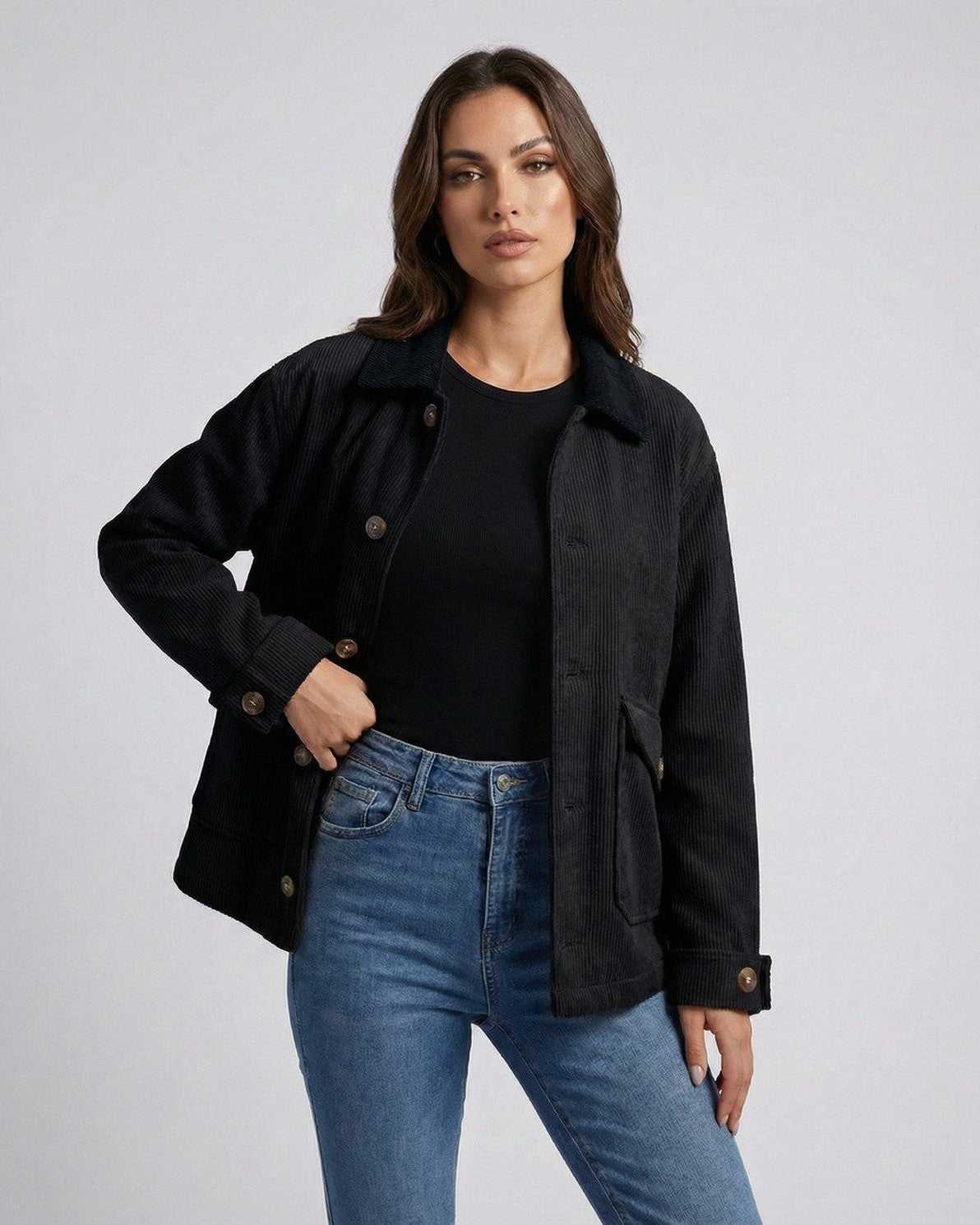 This women’s casual jacket features a corduroy-inspired finish that adds depth and dimension to the classic black tone. The lapel collar and long sleeve construction make it a versatile fall jacket for women, ideal for layering through transitional weather.