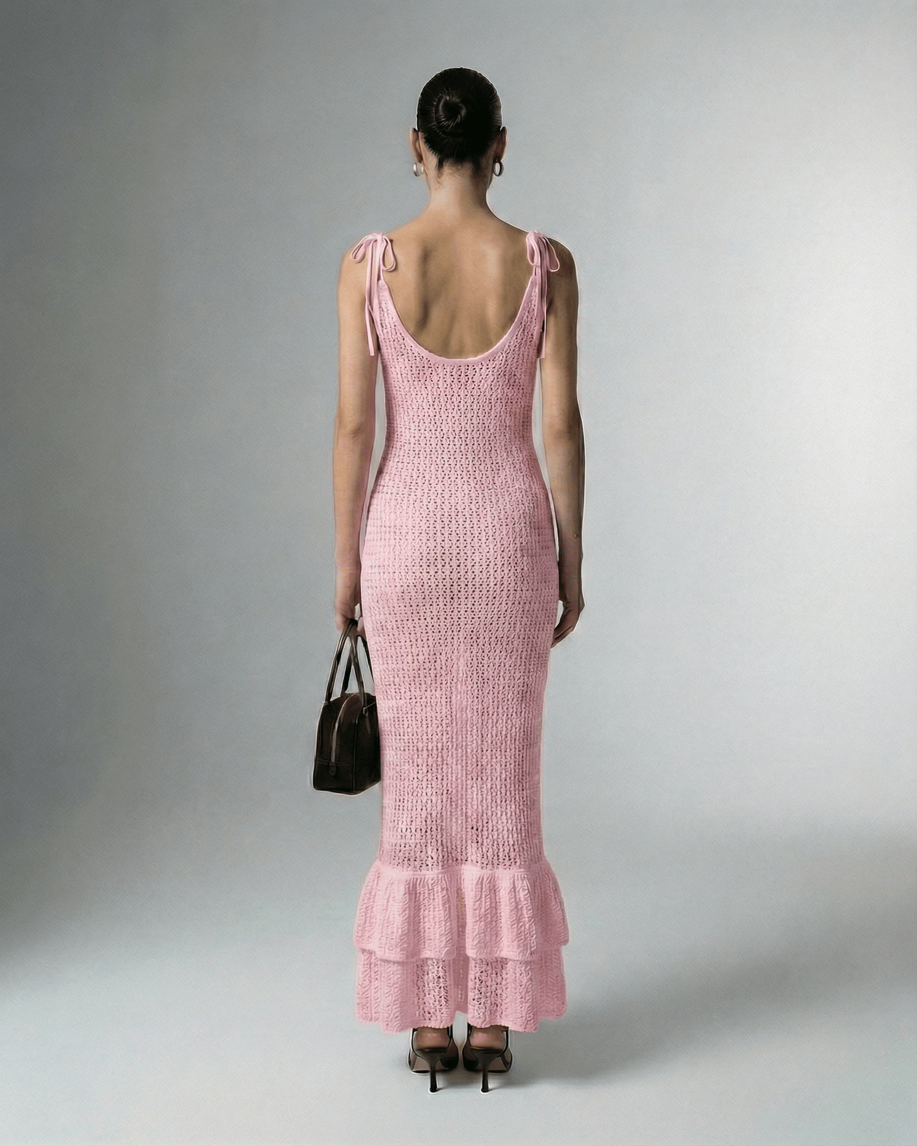 A modern pink bodycon maxi dress designed for sophisticated seasonal styling.