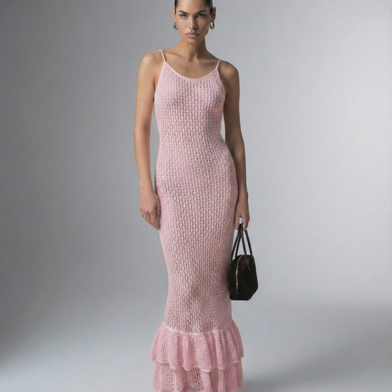 The Rosaline Maxi Dress is a refined pink maxi dress crafted in a sculpted bodycon silhouette with intricate hollow out knit texture. Designed in a soft cotton polyester blend, this women’s maxi dress features a sleek high waist construction and elongated shape that creates a clean, modern line. The textured finish adds dimension while maintaining a polished, elevated aesthetic.