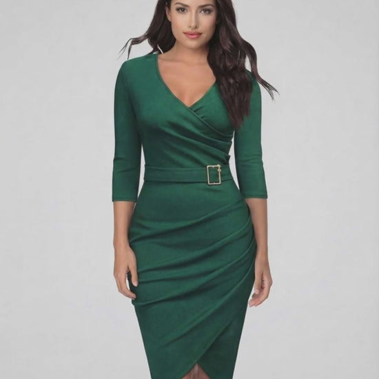 The Sylva Midi Dress captures timeless sophistication with its modern design and flattering fit. Featuring a deep V-neckline and three-quarter sleeves, this sheath dress is tailored to enhance your natural silhouette with a chic belted waist detail. The rich green hue adds a refreshing and luxurious touch to your wardrobe, perfect for formal events or stylish evenings out.