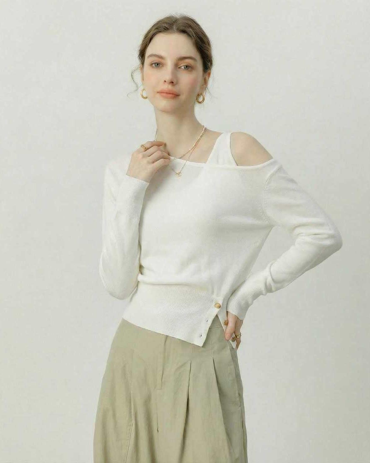 The Sienna Pullover is a refined white pullover designed for modern sophistication. Featuring a contemporary off shoulder pullover neckline with a subtle criss cross effect, this long sleeve pullover blends minimalism with architectural detail.
