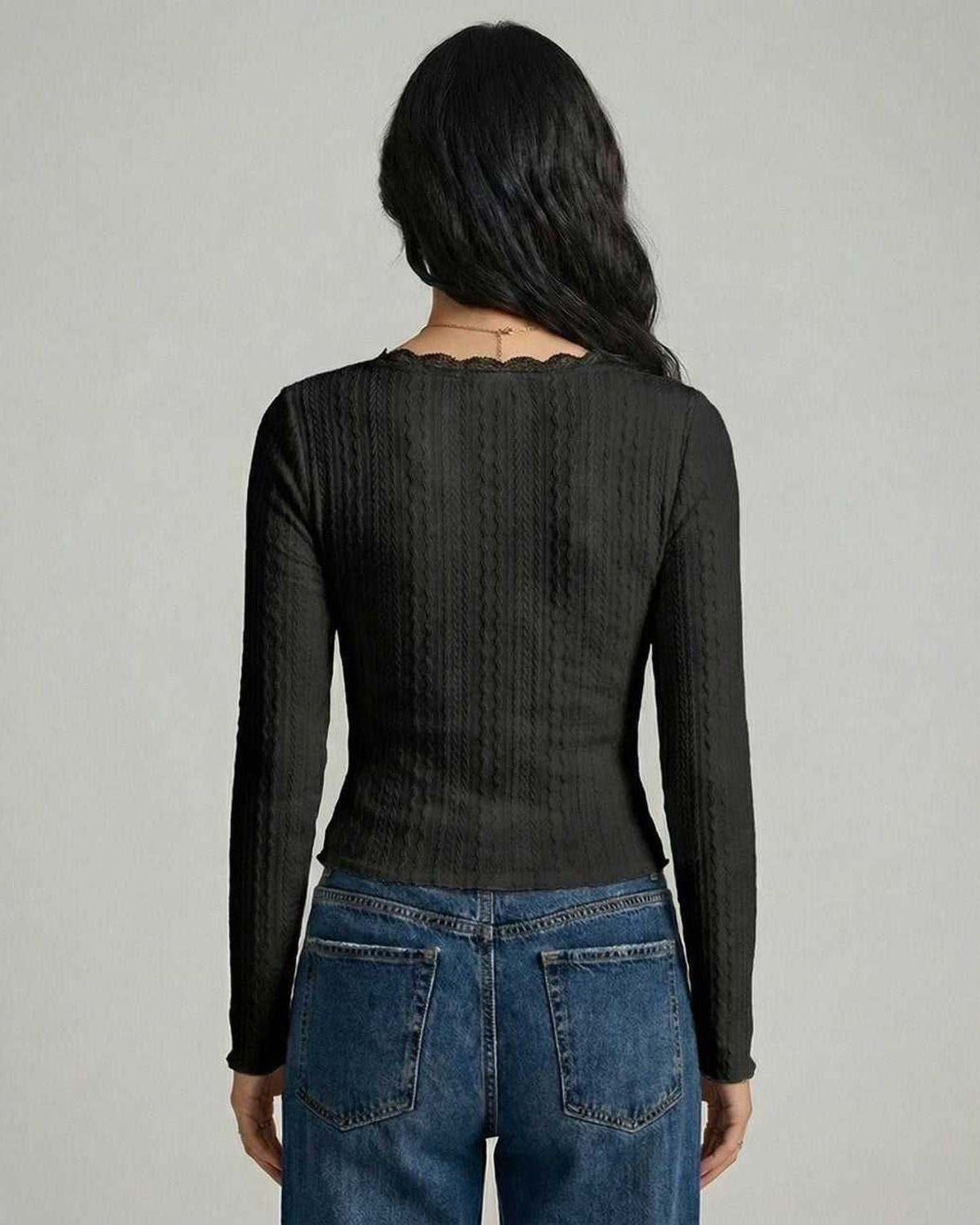 Naiste must pitsiline V-kaelusega pika varrukaga kampsun on loodud peene minimalismi ja kaasaegse nüansiga. Skulpturaalse kitsas lõike ja õrna pitsilise kaelusega pakub see naiste kampsun sujuvat siluetti koos tõstetud detailidega.