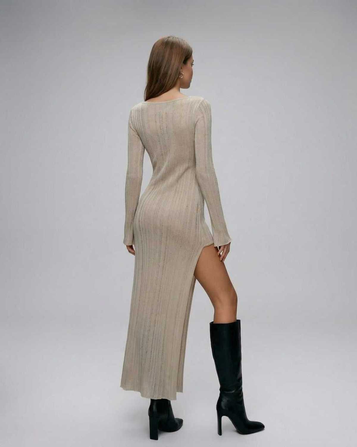 Sienna Midi -mekko määrittelee uudelleen vaivattoman hienostuneisuuden sulavalla siluetillaan ja muotoilevalla ribbineuloksellaan. Pitkähihainen neulottu midi-mekko on suunniteltu modernilla epäsymmetrisellä helmalla ja näyttävällä reiden halkiolla, joka pidentää vartaloa säilyttäen samalla hillityn eleganssin. Pehmeä neutraali sävy korostaa sen monikäyttöisyyttä, tehden siitä ajattoman vaatekaapin peruspilarin.