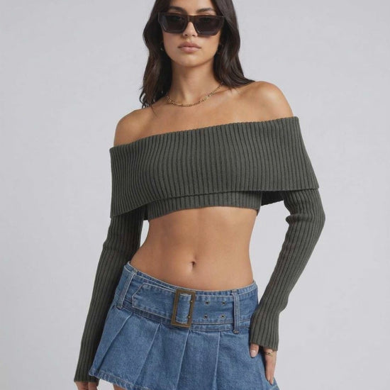Hienostunut naisten olkapäät paljastava pitkähihaisen lyhyt pusero itsevarmaan kausipukeutumiseen.
