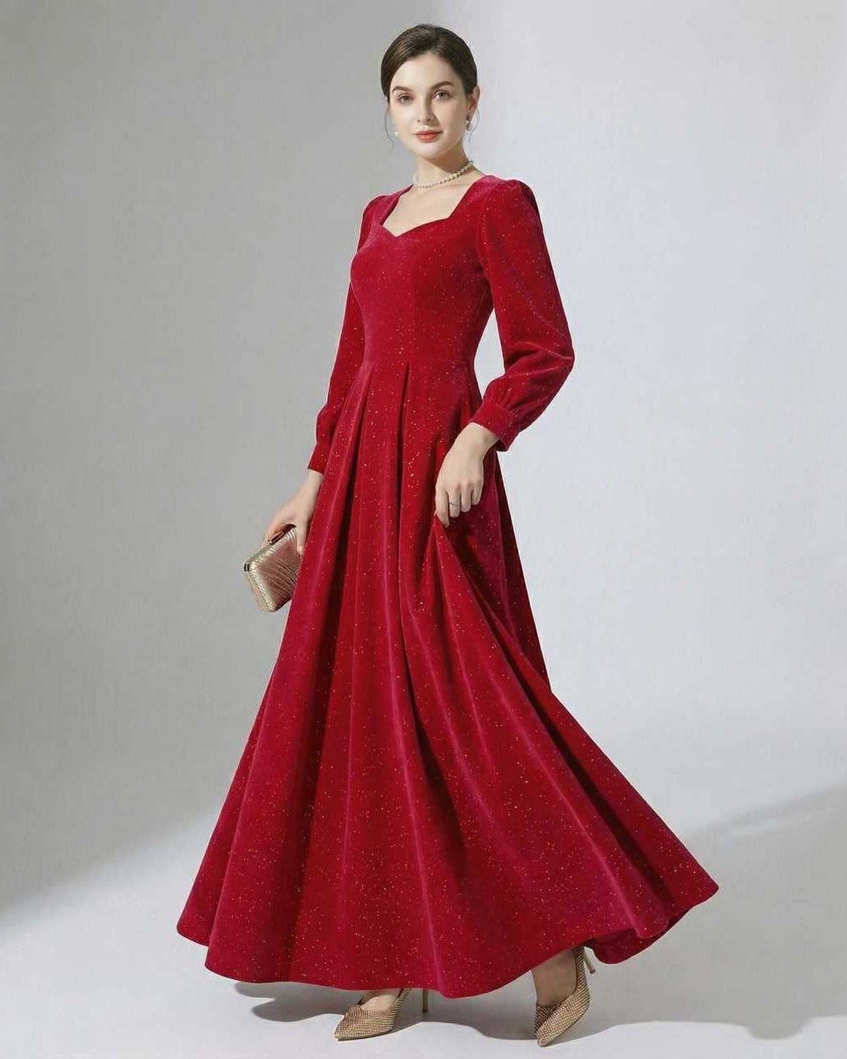 Découvrez l’élégance intemporelle avec la robe maxi Celeste, confectionnée dans un velours polyester de qualité supérieure offrant une légère élasticité pour un confort optimal. La teinte rouge profonde, rehaussée de subtils accents scintillants, crée un éclat captivant idéal pour les occasions formelles. Conçue avec une silhouette en ligne A, cette robe longue tombe gracieusement jusqu’au sol, alliant style classique et glamour contemporain.