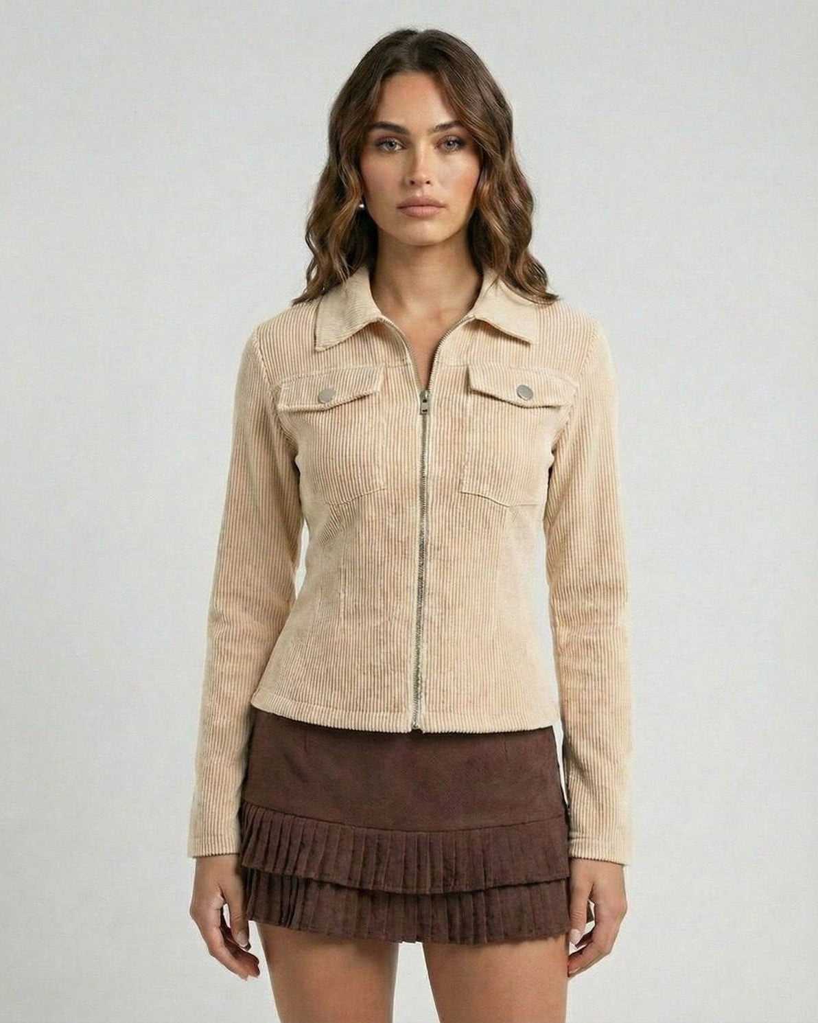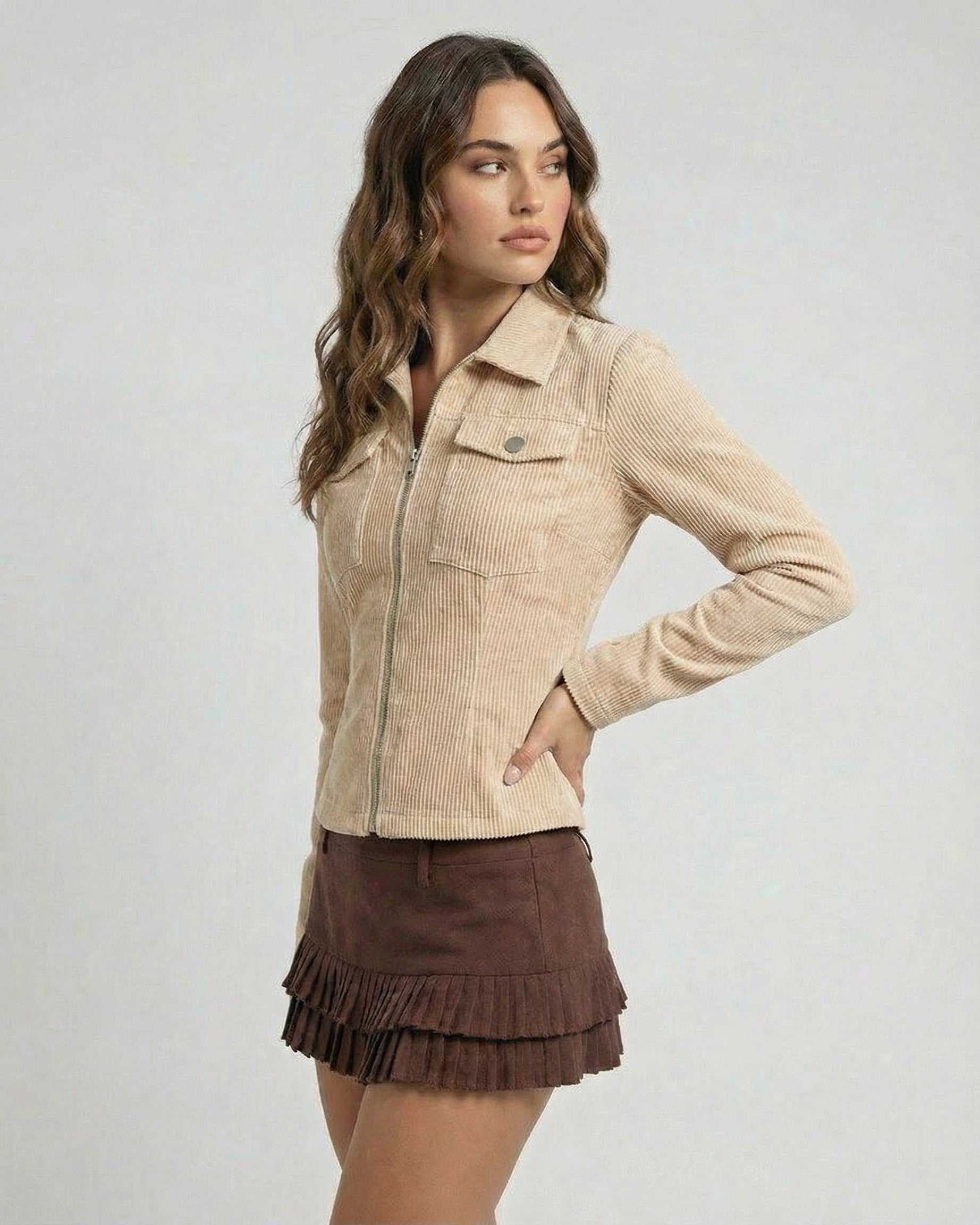 Faite en velours côtelé polyester texturé, cette veste zippée présente un col à revers classique et une fermeture éclair frontale épurée pour une finition moderne et nette. Sa teinte beige chaleureuse en fait une pièce polyvalente à superposer, qui s’accorde à merveille avec des tenues décontractées ou plus sophistiquées.