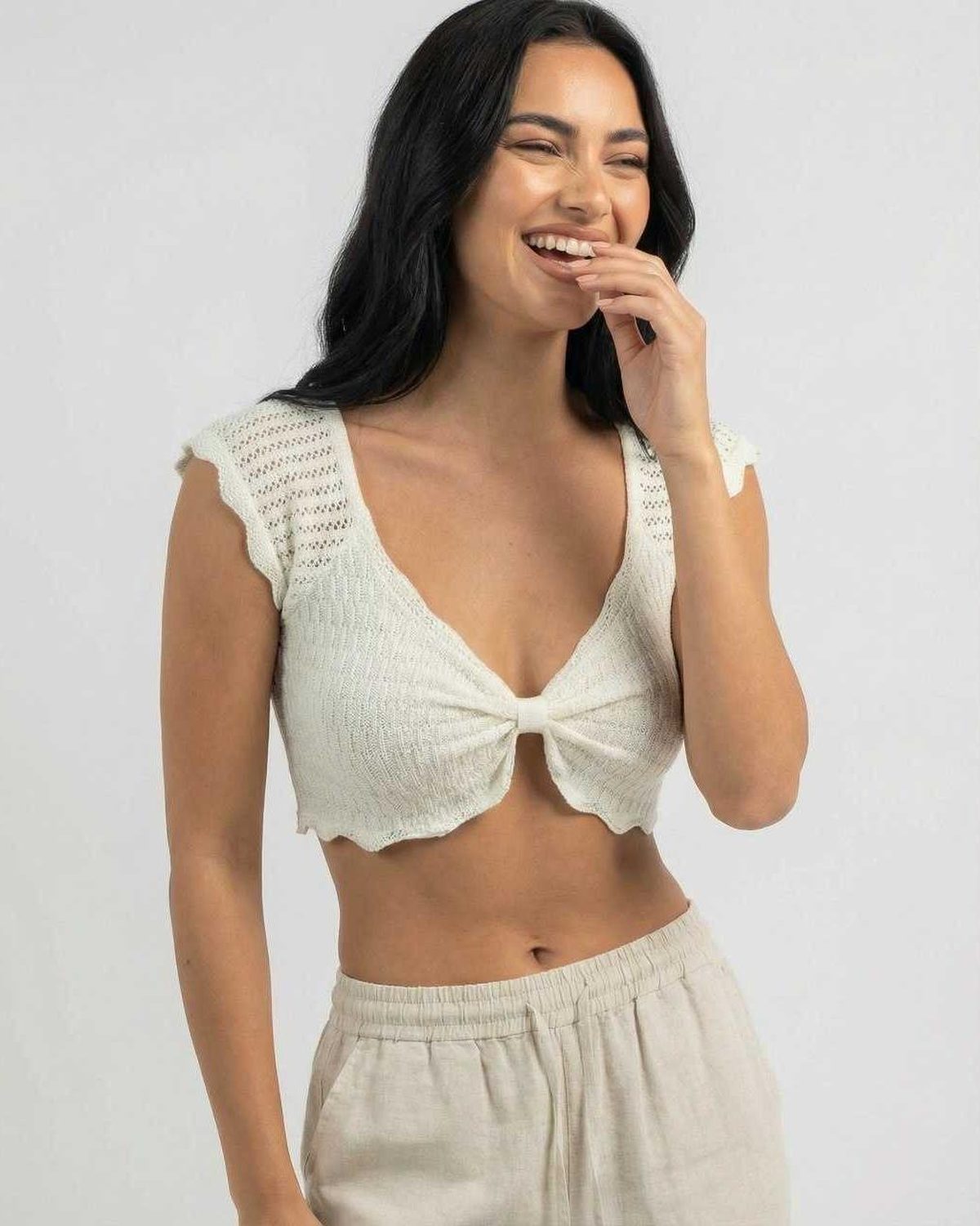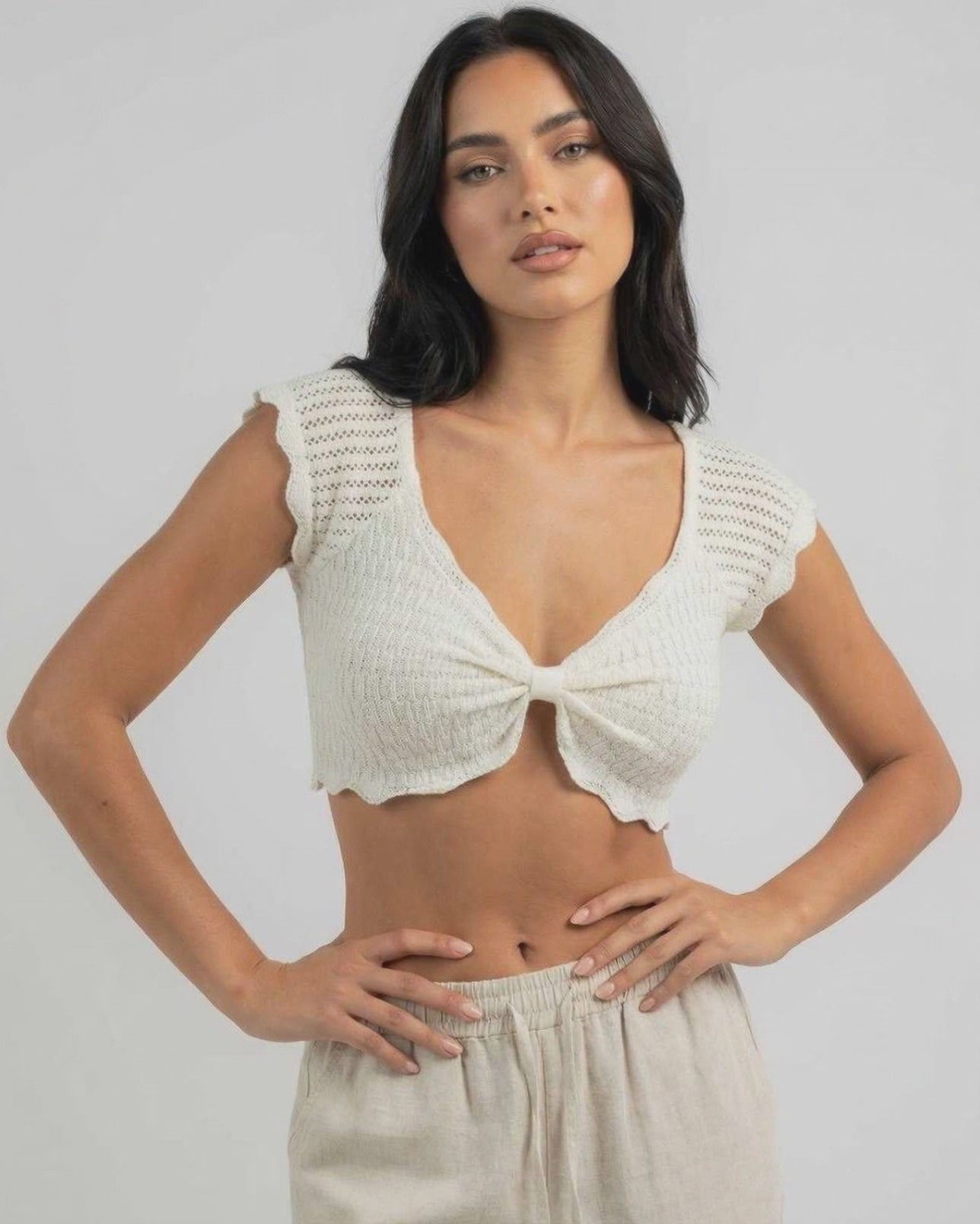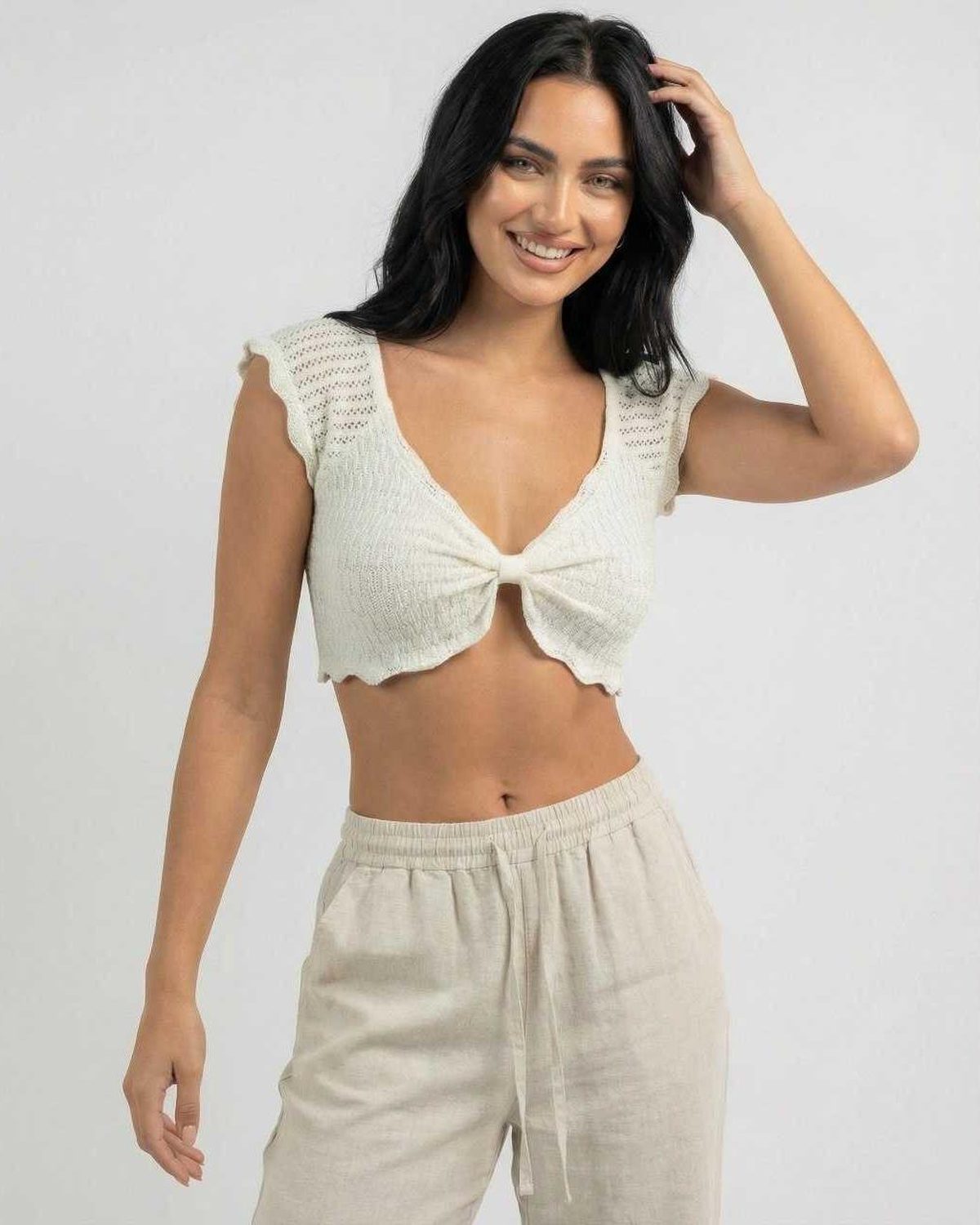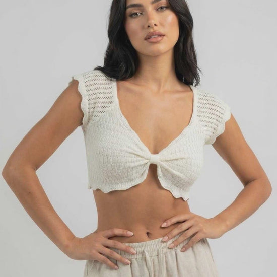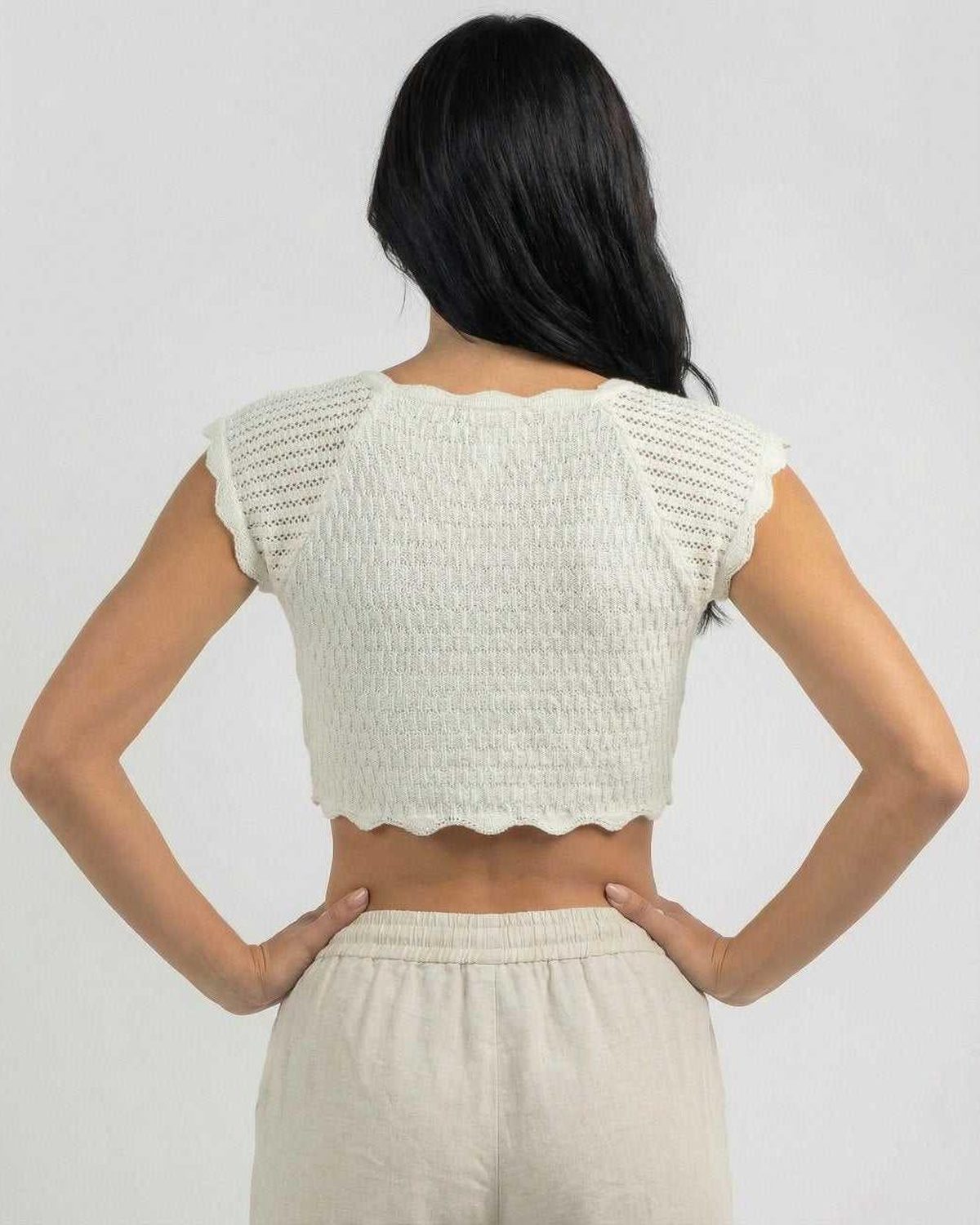 הטופ הסרוג הרומנטי הזה גמור בקצוות גבעול חסה עדינים לאורך השרוולים והשוליים, ומעניק תחושה קלה אך עם מבנה. האורך הקצר משתלב נפלא עם מכנסיים בגזרה גבוהה, חצאיות או מכנסי פשתן רפויים למראה מלוטש אך נינוח.