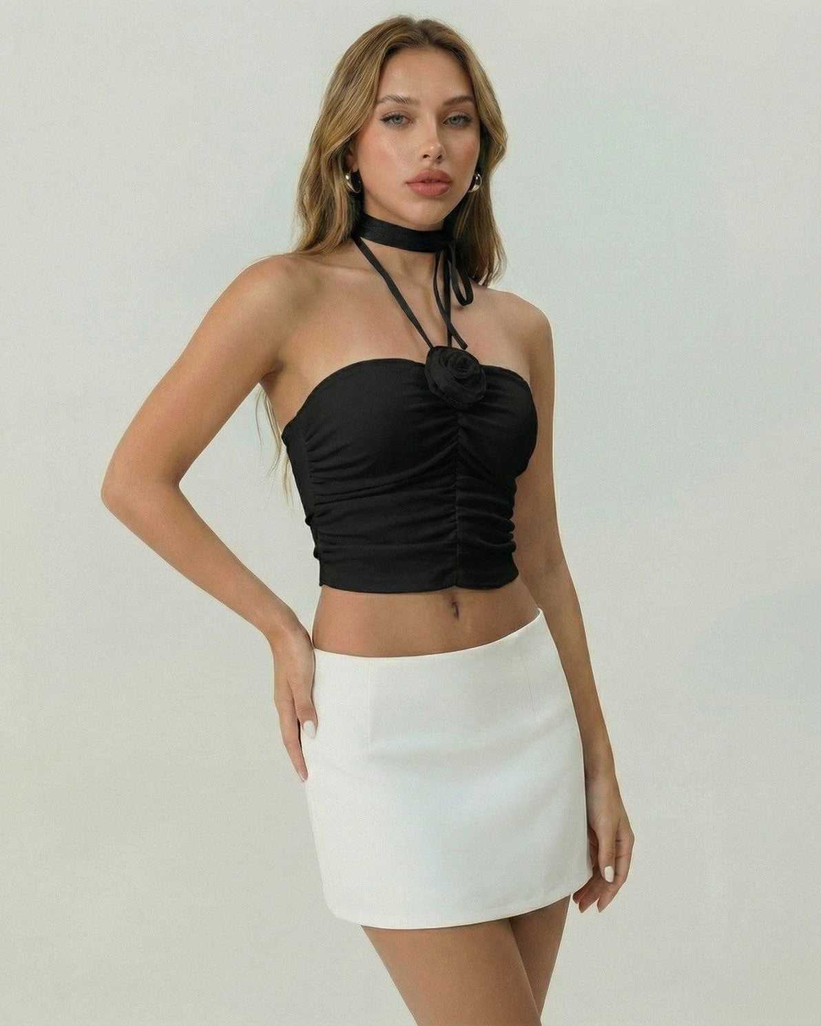 עשוי מבד ברודקלות איכותי עם מתיחה קלה, טופ קצר זה מציע התאמה בטוחה ונוחה. החלק העליון המעוצב ותפירת פרח מרכזית מוסיפים עומק, מה שהופך את הטופ השחור לאידיאלי למראה ערב, לאירועים ולחגיגות מיוחדות.