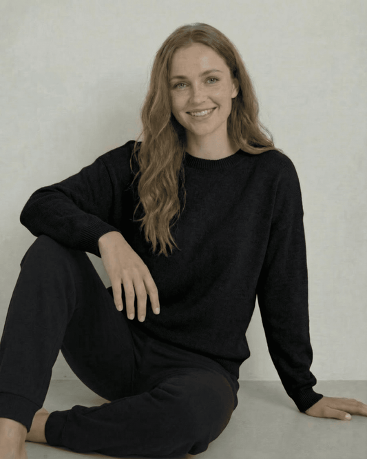 • Alba Blouse by Lauven: Long sleeve sequin blouse with round neck, featured on a model.