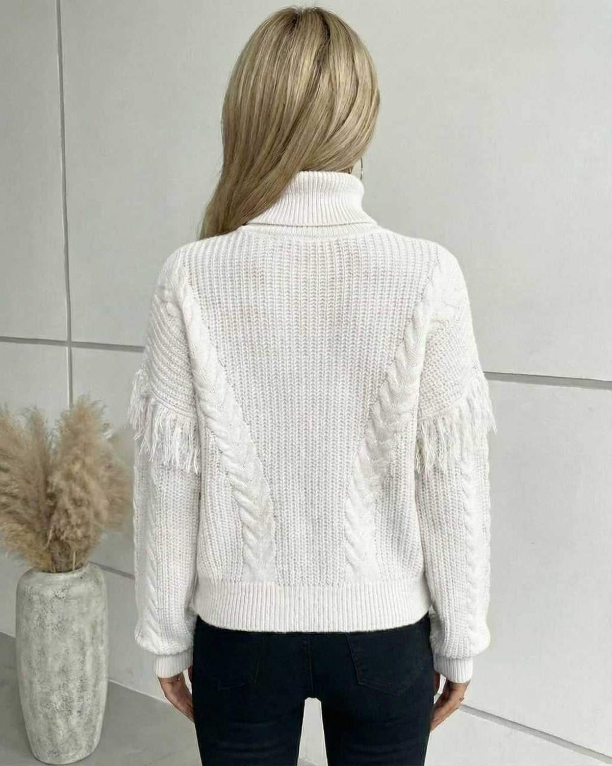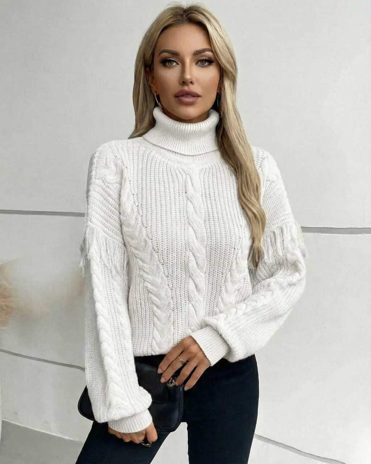 Elegante e senza tempo, questo maglione a collo alto bianco da donna è pensato per donare una texture raffinata al tuo guardaroba autunnale e invernale. Caratterizzato da dettagli intricati a maglia a treccia e sottili rifiniture a frange lungo le maniche, questo maglione a manica lunga unisce l’artigianalità classica a una sofisticatezza moderna.