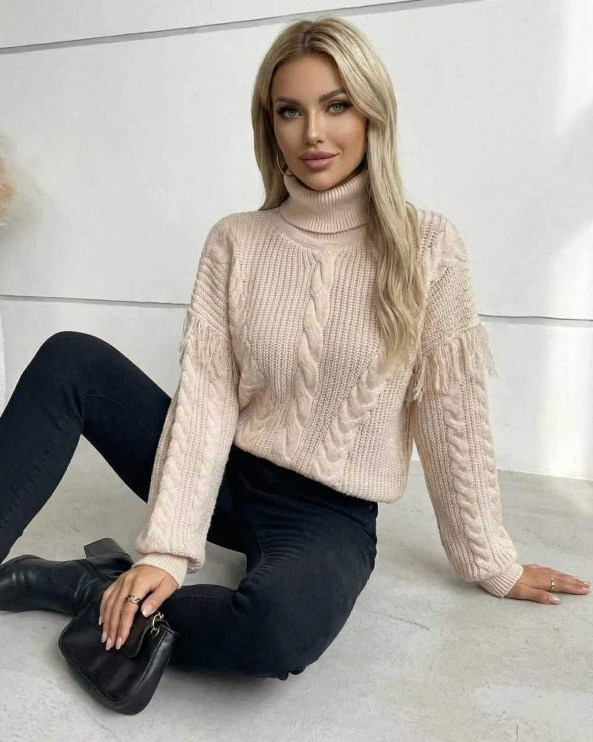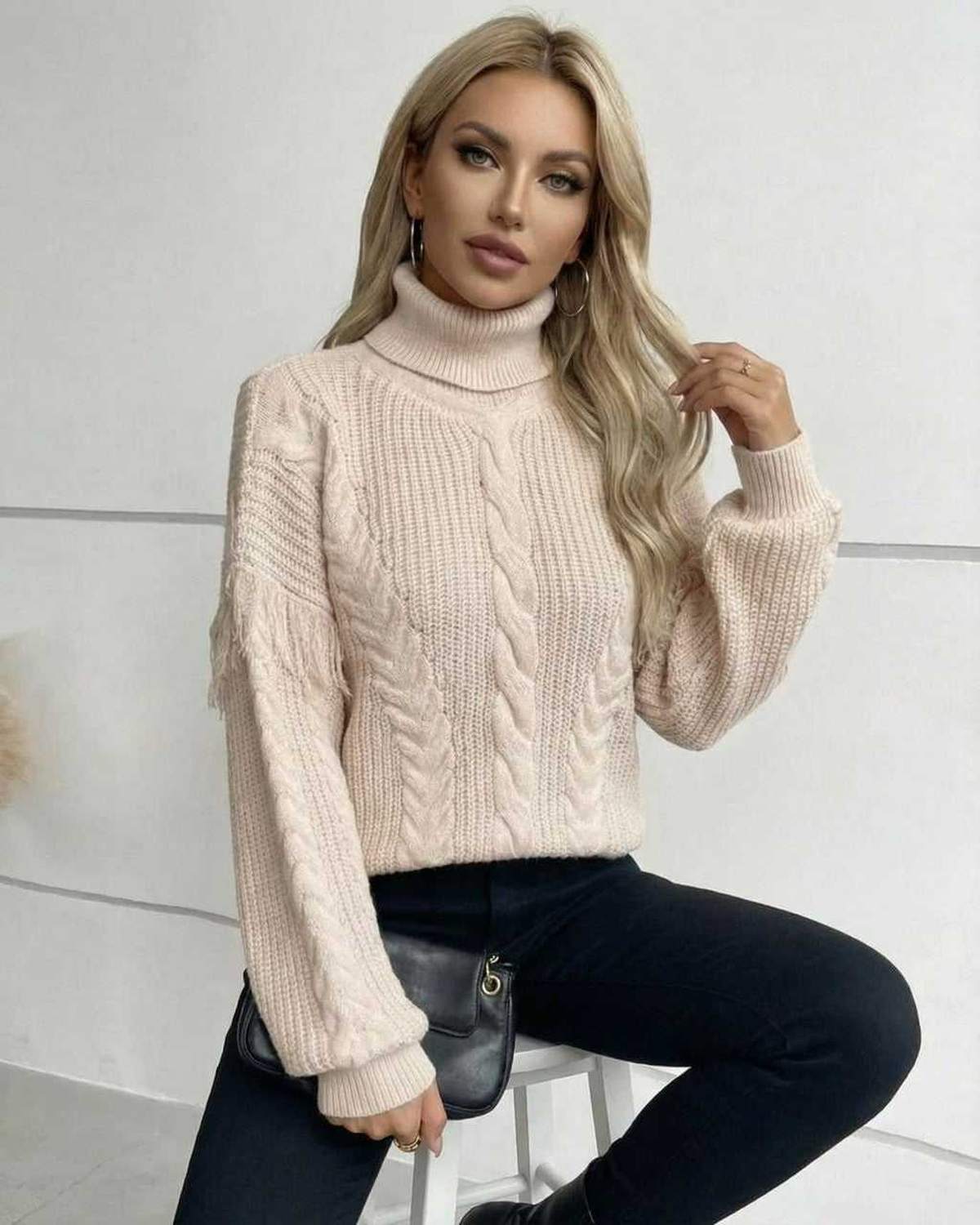 Raffinato ed elegantemente senza sforzo, questo maglione a collo alto beige da donna è pensato per valorizzare il tuo guardaroba nelle giornate fredde. Caratterizzato da una classica lavorazione a treccia con delicati dettagli di frange lungo le maniche, questo maglione a manica lunga unisce texture e sofisticatezza moderna.
