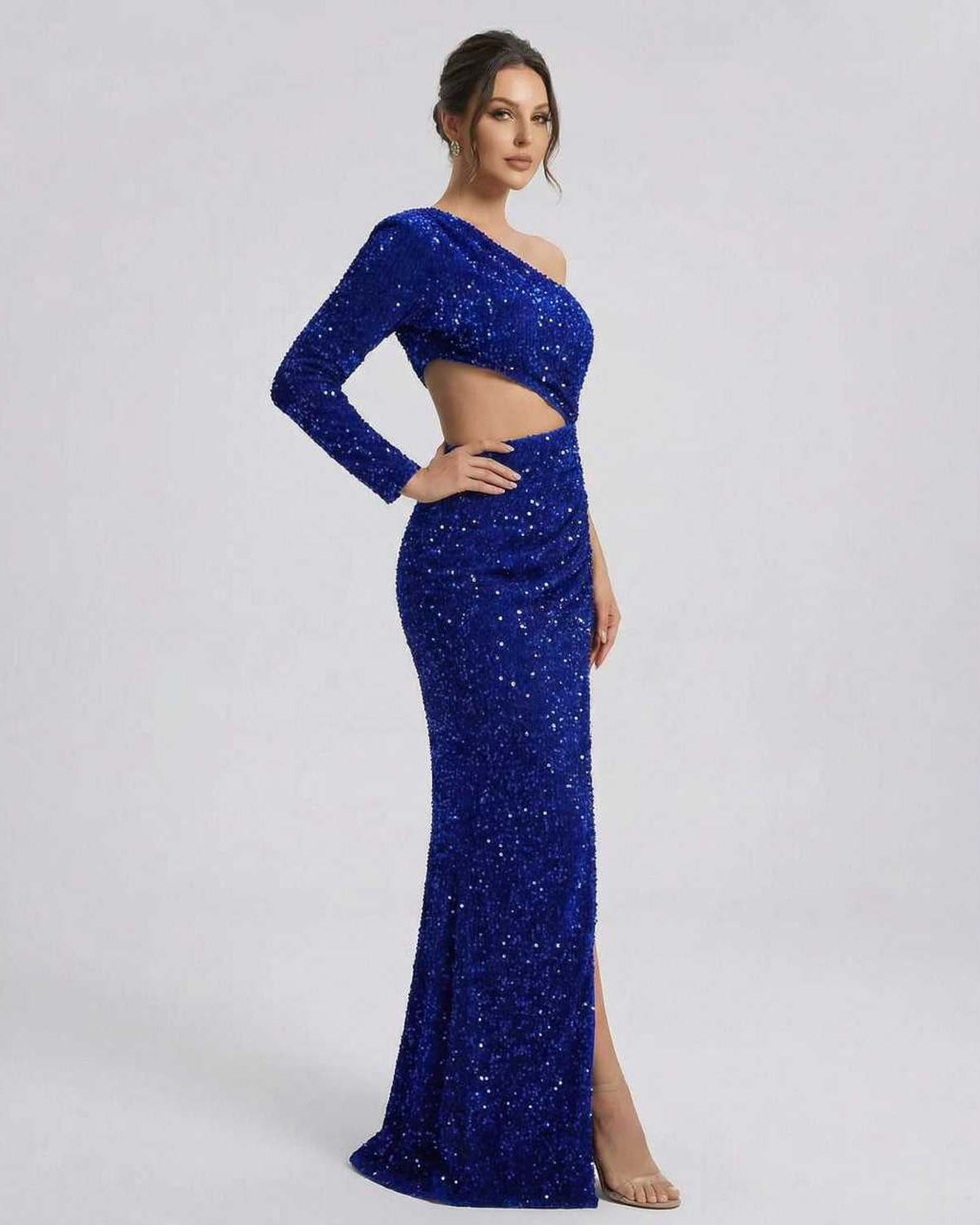 Ontworpen met een kenmerkende asymmetrische halslijn en een lange mouw aan één schouder, heeft deze jurk een empire taille en een gewaagde zijuitsnijding voor een eigentijdse uitstraling. De slanke pasvorm en geplooide details accentueren de figuur zonder bewegingsvrijheid te beperken. Een lange split aan de zijkant verhoogt zowel de aantrekkingskracht als de draagbaarheid, terwijl een onopvallende ritssluiting zorgt voor een naadloze afwerking.