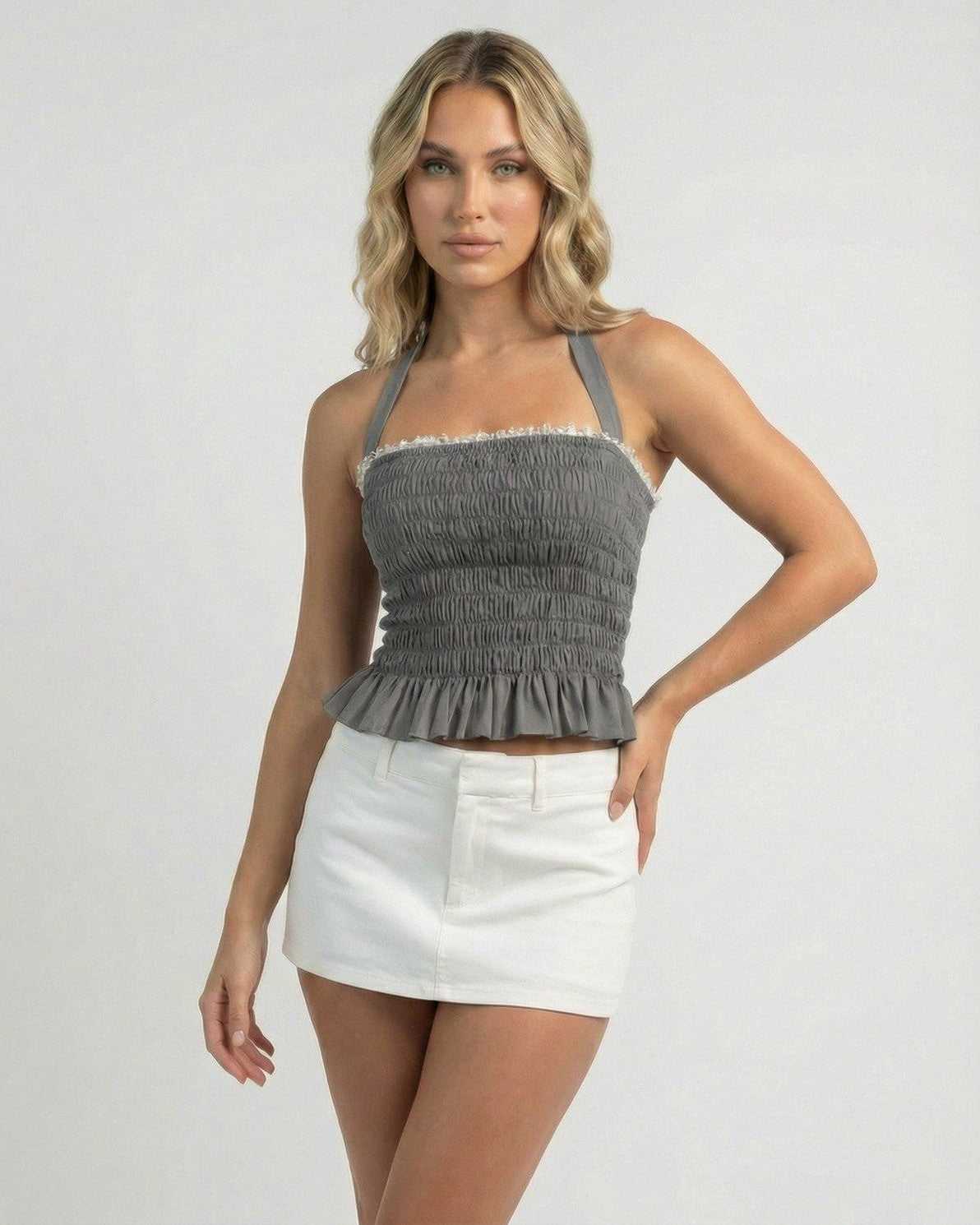 Dames grijze halter top met slanke pasvorm en ruches, ideaal voor zomer, vakantie, feest en informele gelegenheden.