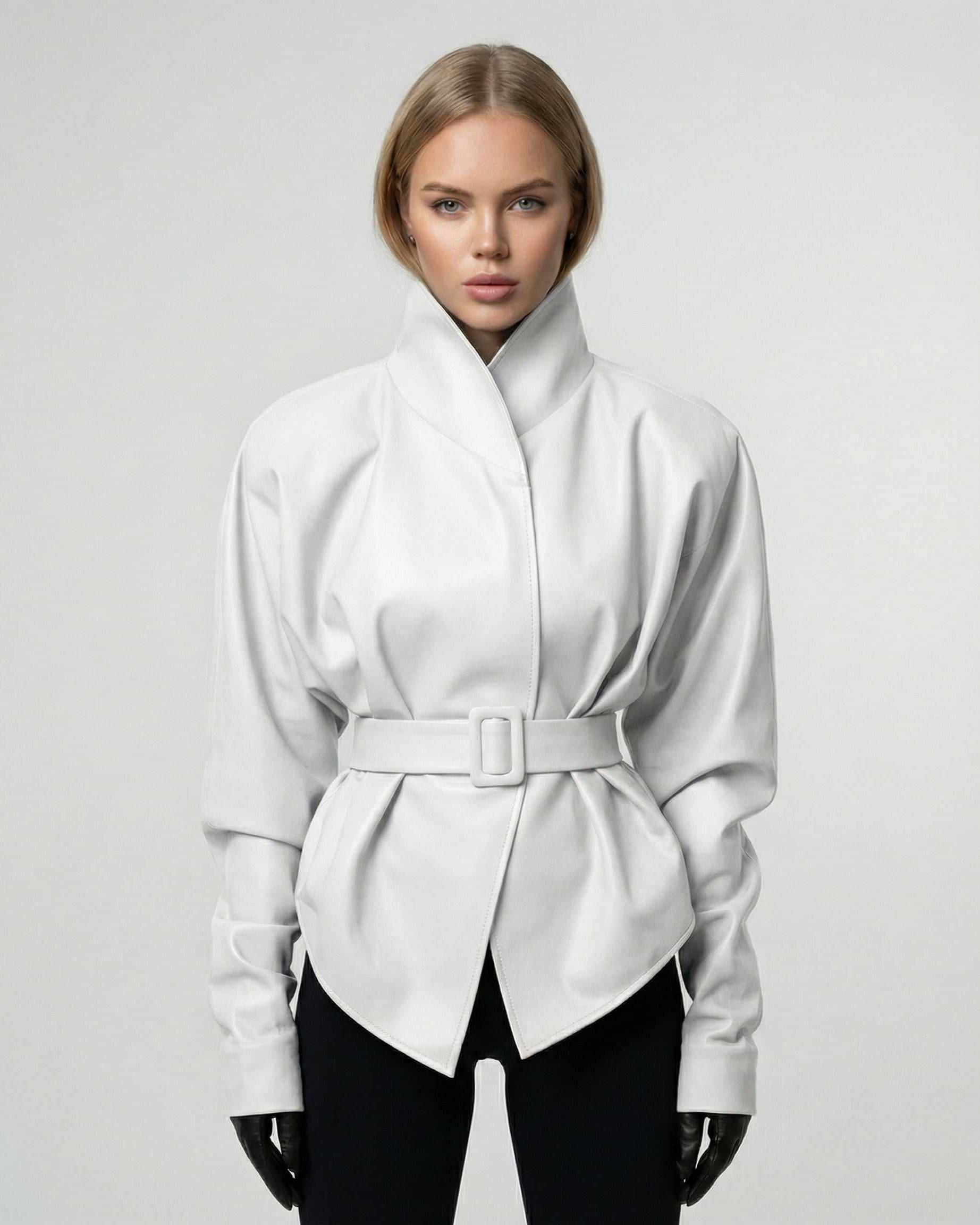 Met een scherpe mandarijnkraag en lange mouwen, benadrukt deze getailleerde jas de taille met een bijpassende riem voor een gevormde, vrouwelijke lijn. De effen witte kleur zorgt voor een zuivere, verfijnde uitstraling, waardoor deze leren damesjas ideaal is voor herfstlagen, avondkleding en opvallende straatmode.