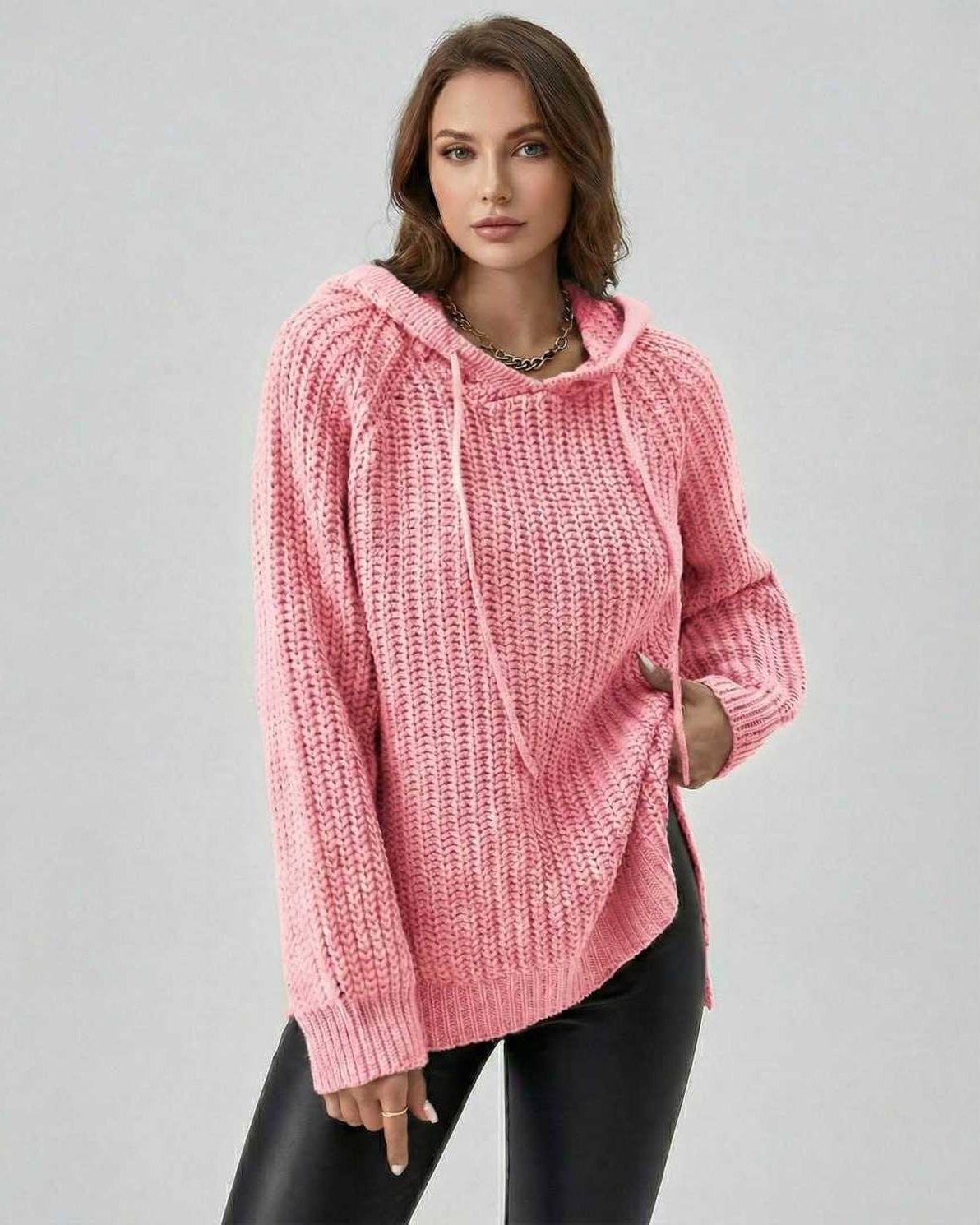 Gemaakt als een damestrui met lange mouwen in een levendige effen roze tint, heeft het een losse pasvorm, geribbelde manchetten en een gestructureerde zoom met subtiele zijsplitten voor natuurlijke bewegingsvrijheid. De verstelbare capuchon met bijpassende trekkoorden geeft een casual maar verzorgde afwerking. Deze oversized gebreide trui biedt warmte en comfort terwijl ze een slanke, modieuze uitstraling behoudt.