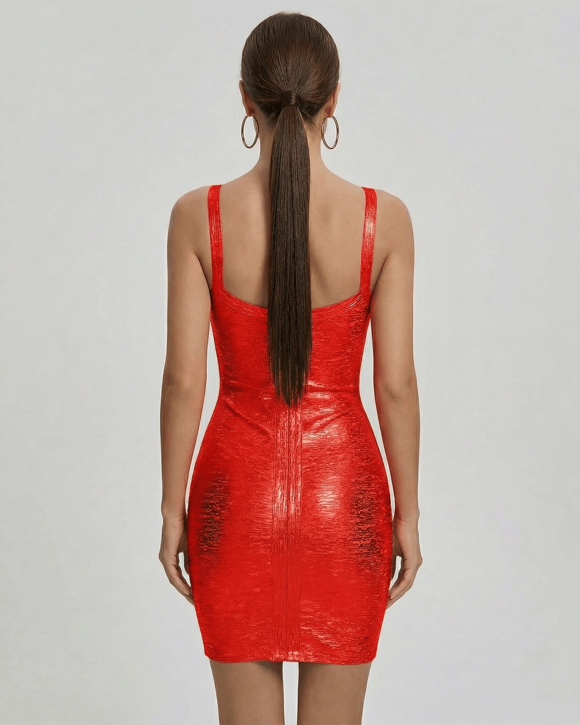 Maak een gedurfd statement met deze levendige rode mini-jurk, vervaardigd van hoogwaardige viscose gemengd met synthetische vezels, die een opvallende glanzende textuur en een slanke, aansluitende pasvorm biedt. De rijke rode tint en subtiele glans zorgen voor een eigentijdse, glamoureuze uitstraling, ideaal voor bijzondere gelegenheden.