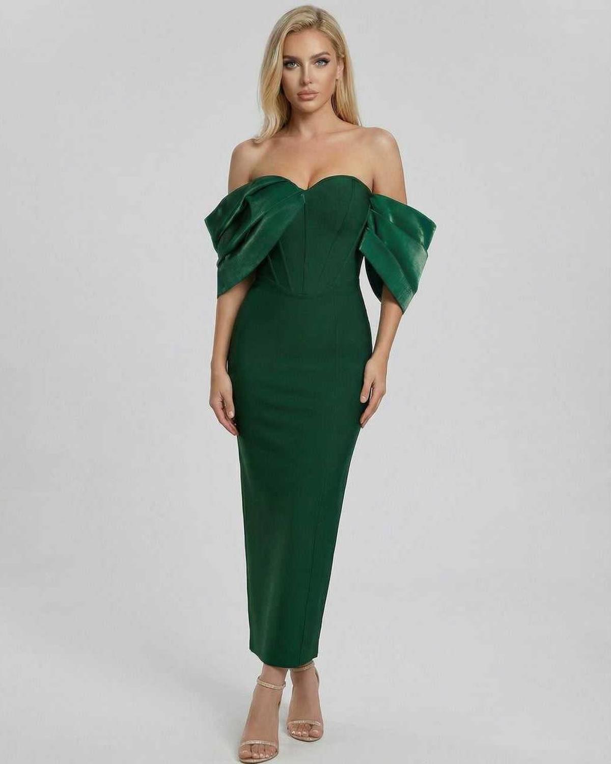 Met een gestructureerde vierkante halslijn en opvallende korte off-shoulder mouwen, combineert deze enkellange midi-jurk moderne allure met tijdloze verfijning. De rijke smaragdgroene tint en de contourerende naden creëren een flatterend zandloperfiguur, waardoor het een ideale cocktail-midi-jurk is voor avonddiners, bruiloftsgasten en chique zomerse evenementen.