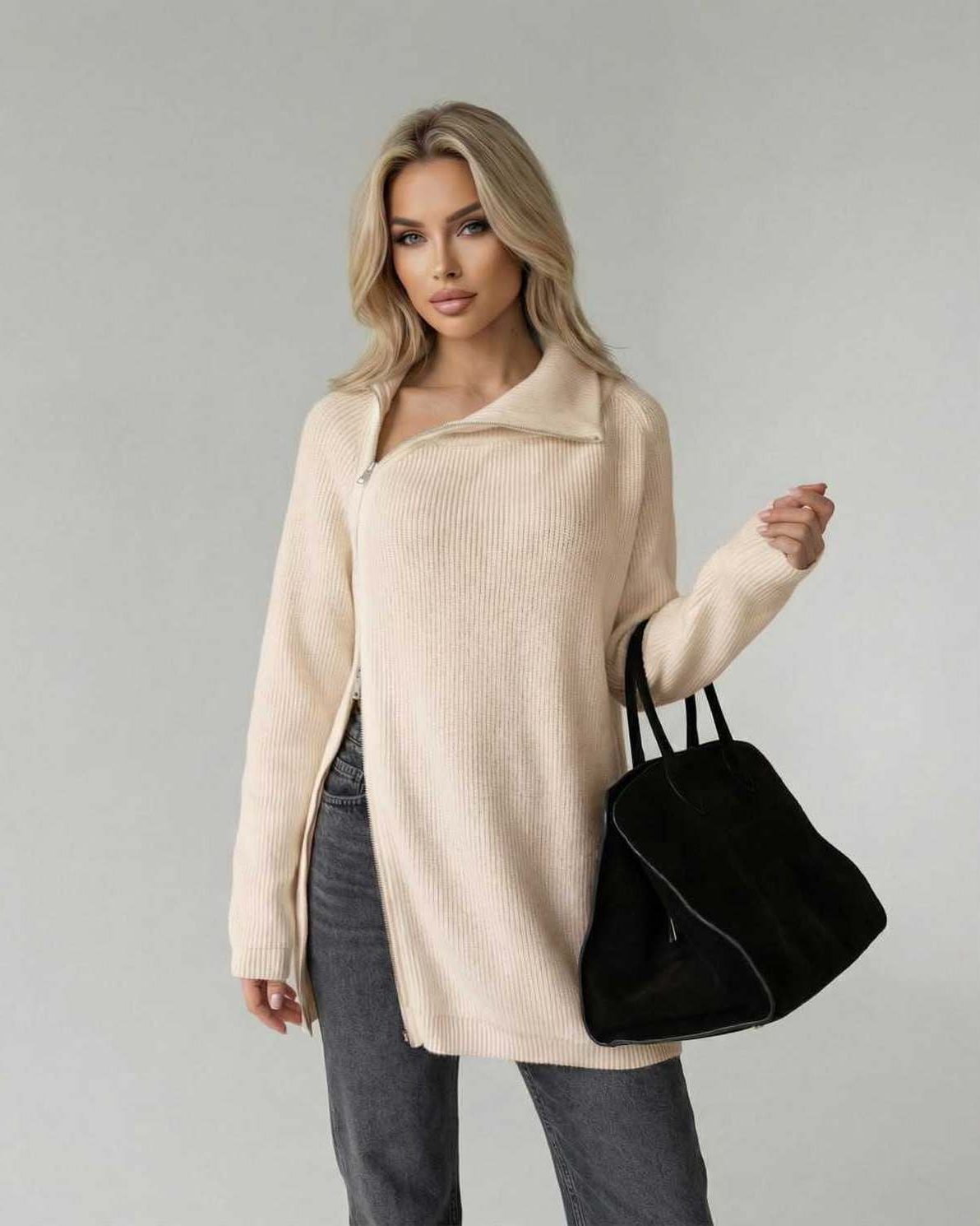 De Dames Beige Coltrui verenigt moderne eenvoud met verhoogd comfort in een verfijnde, verlengde silhouet. Ontworpen in een hedendaagse losse pasvorm, heeft deze trui met lange mouwen een gestructureerde ribgebreide textuur en een elegante hoge kraag met ritssluiting voor een verzorgde afwerking.
