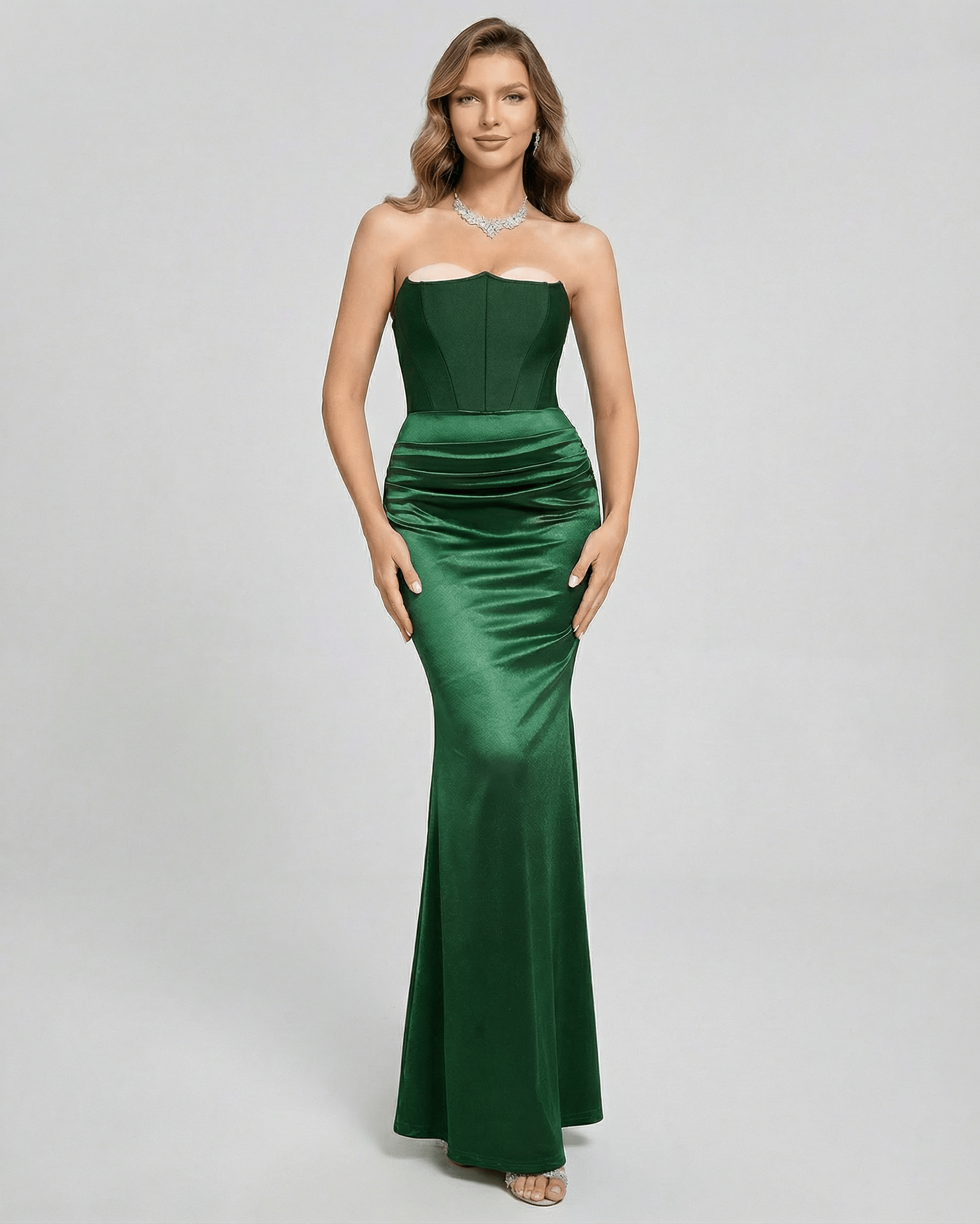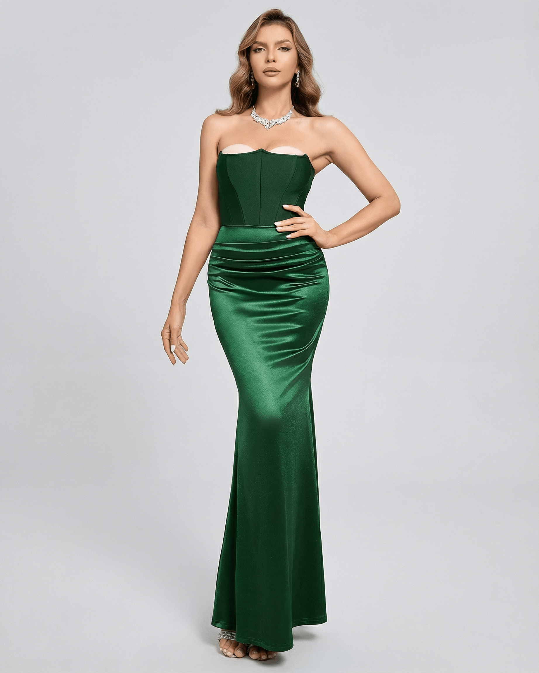 Ta suknia maxi Celeste wykonana jest z luksusowej zielonej satyny o gładkiej, bezramiączkowej sylwetce. Wypolerowany poliester oferuje delikatną elastyczność, zapewniając dopasowany, podkreślający figurę wygląd, zaprojektowany tak, by sięgać kostek, co nadaje ponadczasowy charakter sukni maxi.
