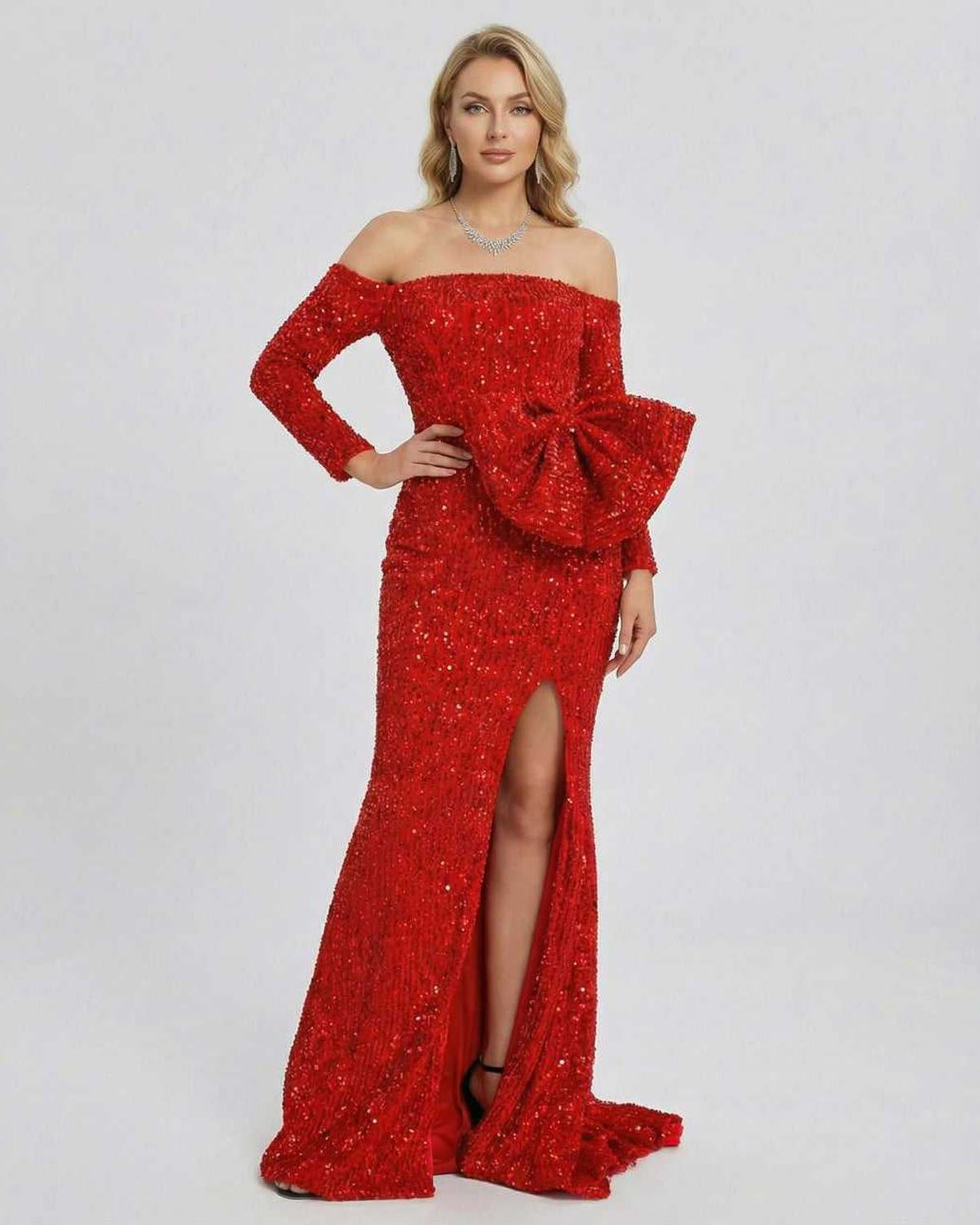 Zaprojaktowana z nowoczesnym dekoltem odsłaniającym ramiona i półdługimi rękawami, ta wyrafinowana suknia oferuje harmonijne połączenie wyrafinowania i zmysłowości. Szczegółowy duży kokardowy akcent w talii dodaje niepowtarzalnego charakteru, a rozcięcie sięgające uda zapewnia swobodę ruchu i wygodę noszenia. Suknia wykonana jest z wygodnej mieszanki spandeksu i poliestru, gwarantującej elastyczne dopasowanie i trwały komfort, bez wbudowanego biustonosza.