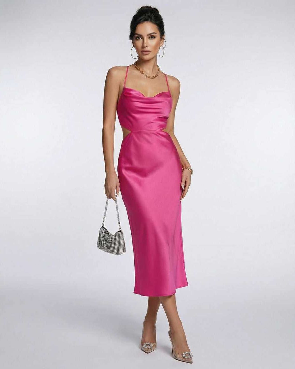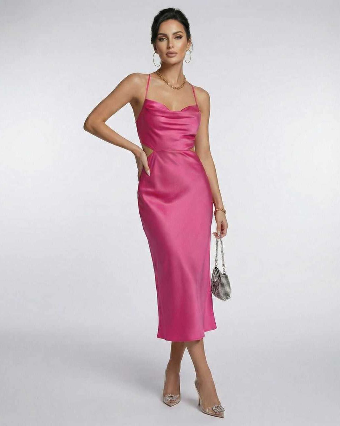 Wznieś swoją garderobę na wyższy poziom dzięki sukience midi Celeste, luksusowej sukni z satyny zaprojektowanej, by przyciągać spojrzenia. Ten wyrafinowany element garderoby cechuje smukła sylwetka o korzystnym, klasycznym kroju, idealna na wyrafinowane wydarzenia i wieczorne okazje. Żywy różowy satynowy materiał dodaje blasku, a gustowne wycięcia oraz krzyżujące się paski na plecach nadają nowoczesny charakter tej ponadczasowej sukience midi.