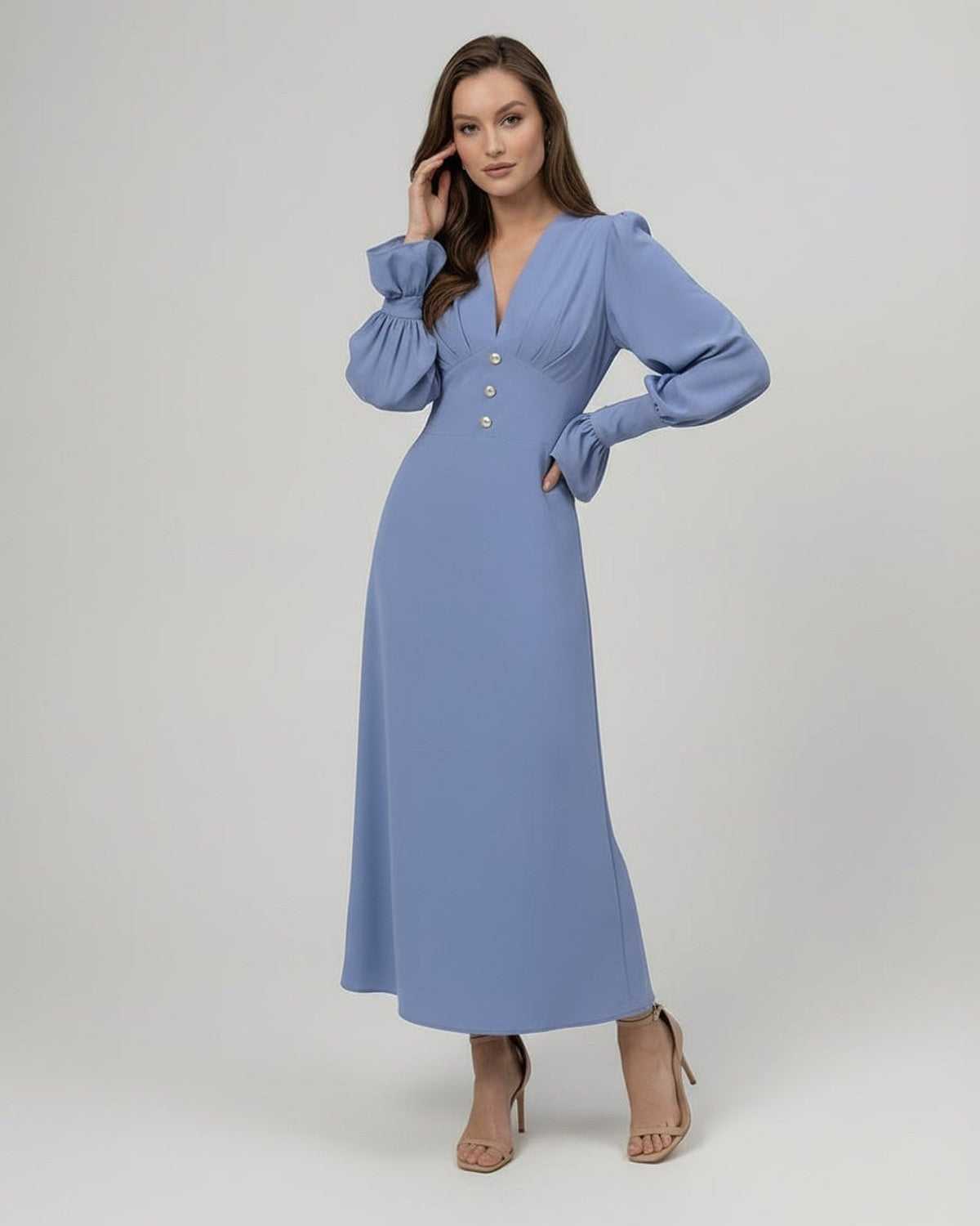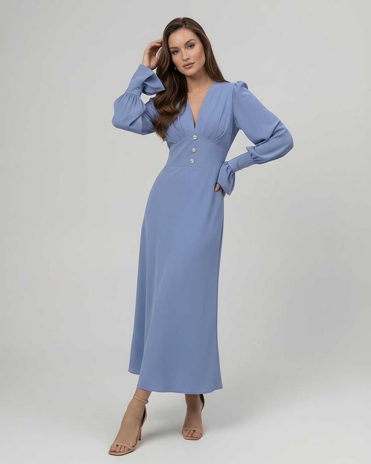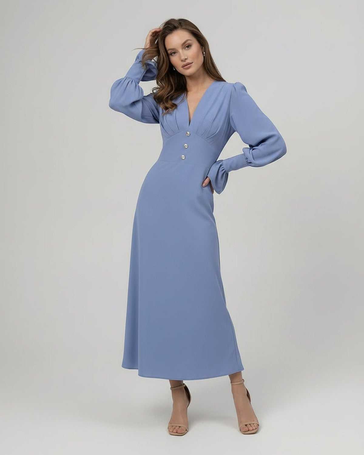 Sukienka Celeste Midi — Niebieska sukienka midi, sukienka midi z długim rękawem, sukienka w linii A