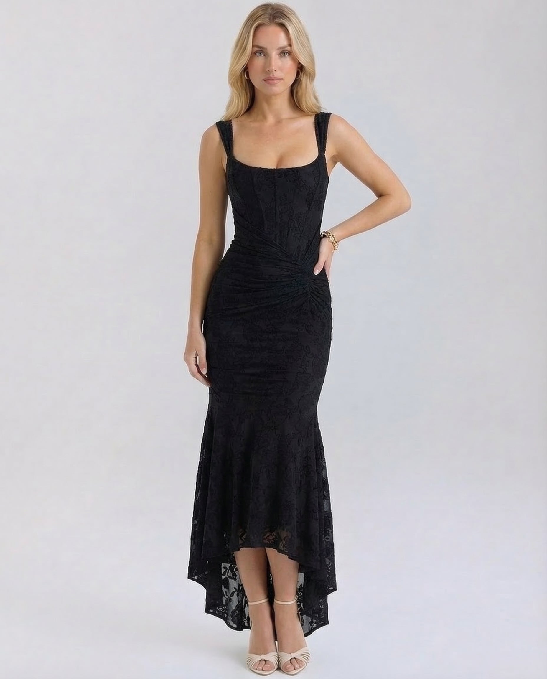Idealna na wieczorne wydarzenia, przyjęcia koktajlowe i oficjalne spotkania, sukienka Maxi Noir doskonale komponuje się z szpilkami i delikatnymi dodatkami, tworząc elegancki, szykowny look.
