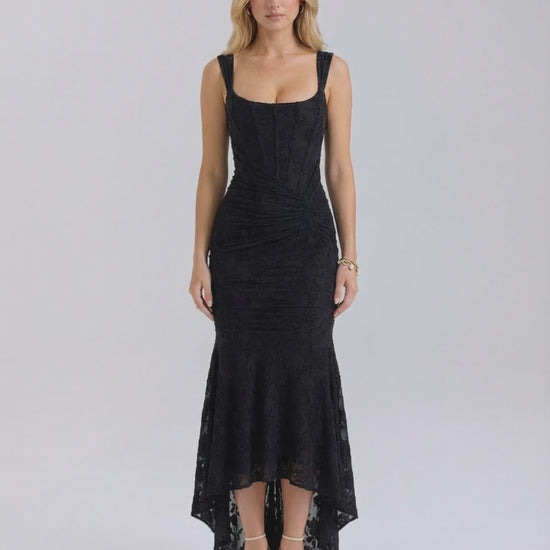 Sukienka Maxi Noir — Elegancka sukienka z kwadratowym dekoltem z żakardu w kolorze czarnym