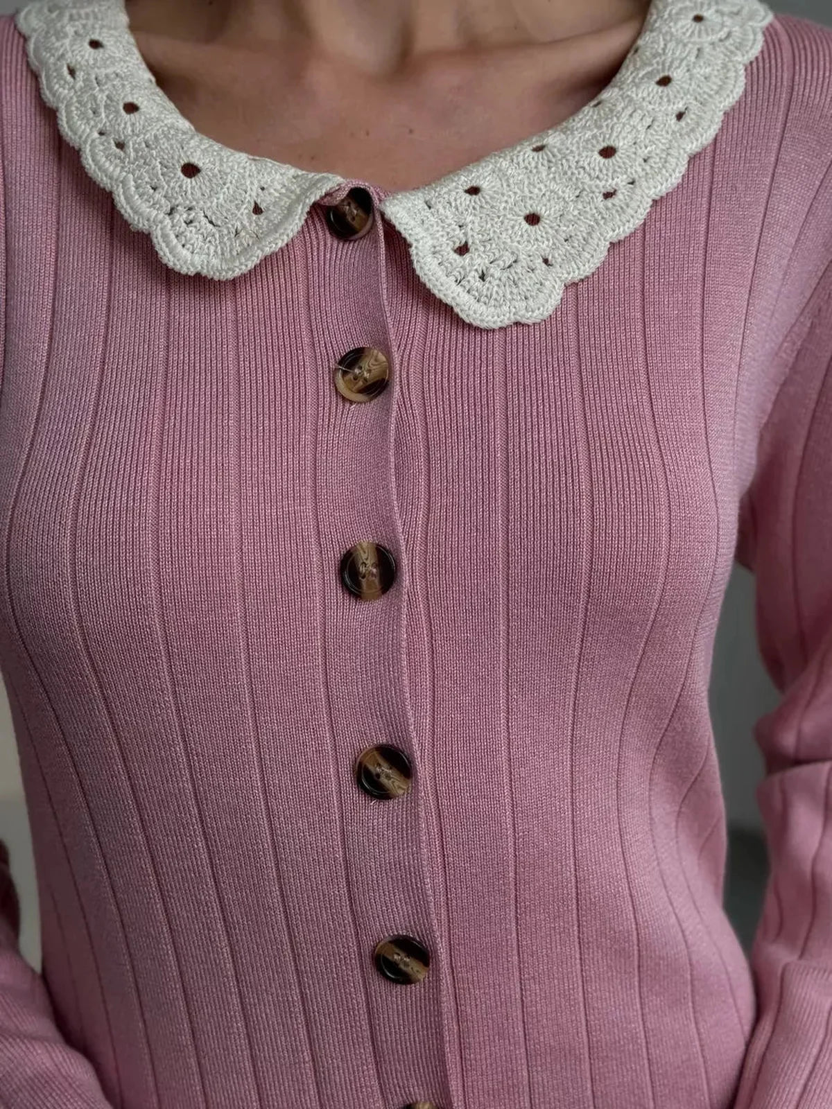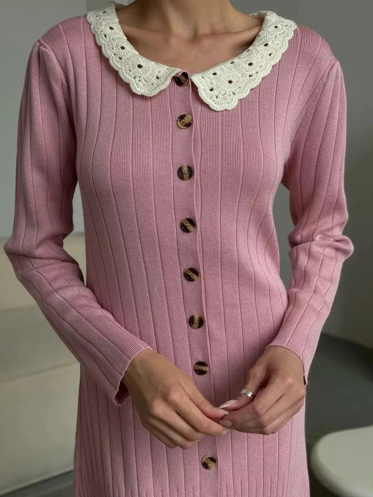 The Amelie Midi Dress is a refined and elegant piece crafted from 100% mercerized cotton ribbed knit fabric, designed to enhance your silhouette with a semi-fitted shape. This maxi dress features a delicate lace collar and a full button-front closure, making it an ideal choice for special occasions and sophisticated events.